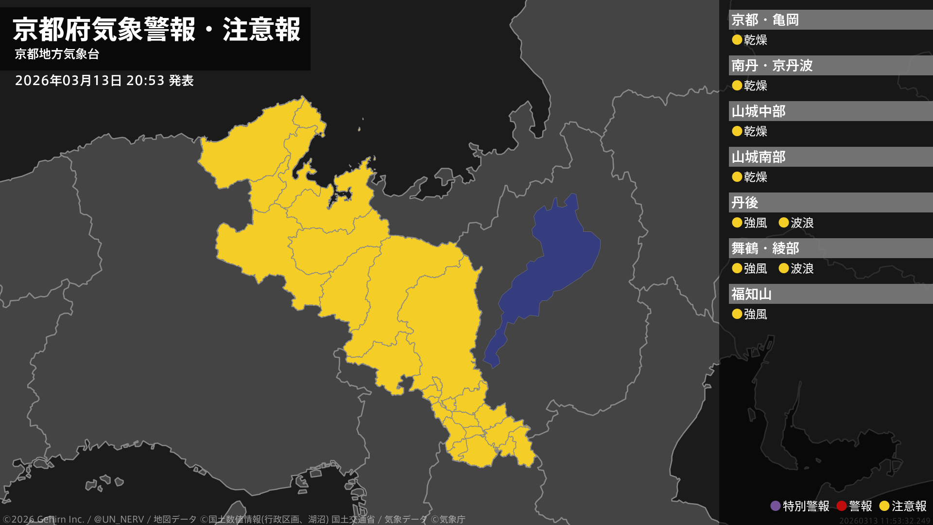 【京都府 気象警報・注意報 2026年03月13日 20:53】北部では、14日朝まで強風に、14日夕方まで高波に注意してください。南部では、14日まで空気の乾燥した状態が続くため、火の取り扱いに注意してください。#気象警報注意報 #京都府