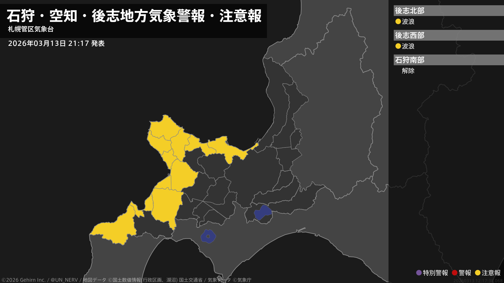 【石狩・空知・後志地方 気象警報・注意報 2026年03月13日 21:17】後志地方では、13日夜遅くまで高波に注意してください。#気象警報注意報 #石狩地方 #後志地方