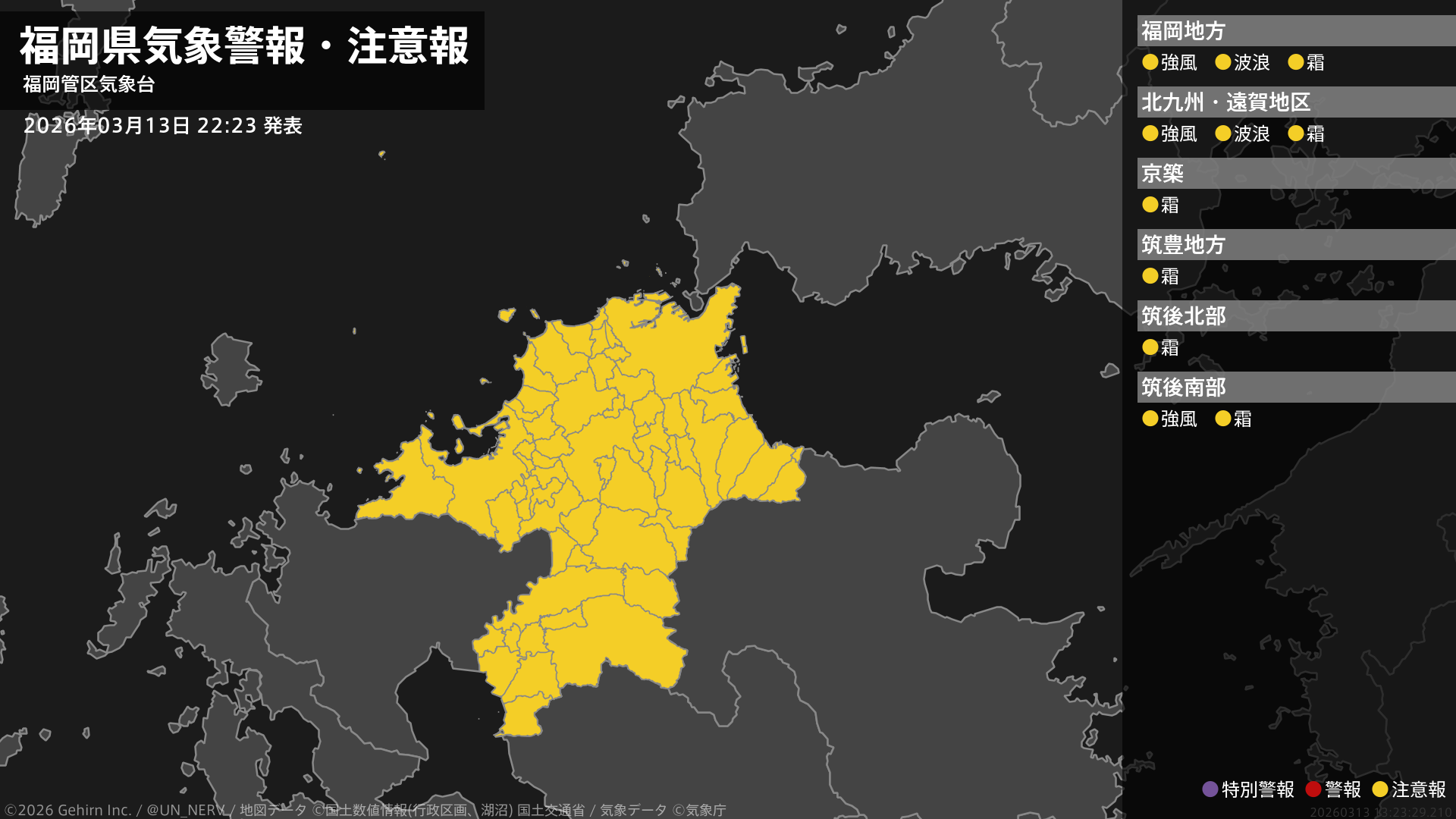 【福岡県 気象警報・注意報 2026年03月13日 22:23】福岡、北九州、筑後地方では、強風に注意してください。福岡、北九州地方では、高波に注意してください。福岡県では、霜に対する農作物の管理に注意してください。#気象警報注意報 #福岡県