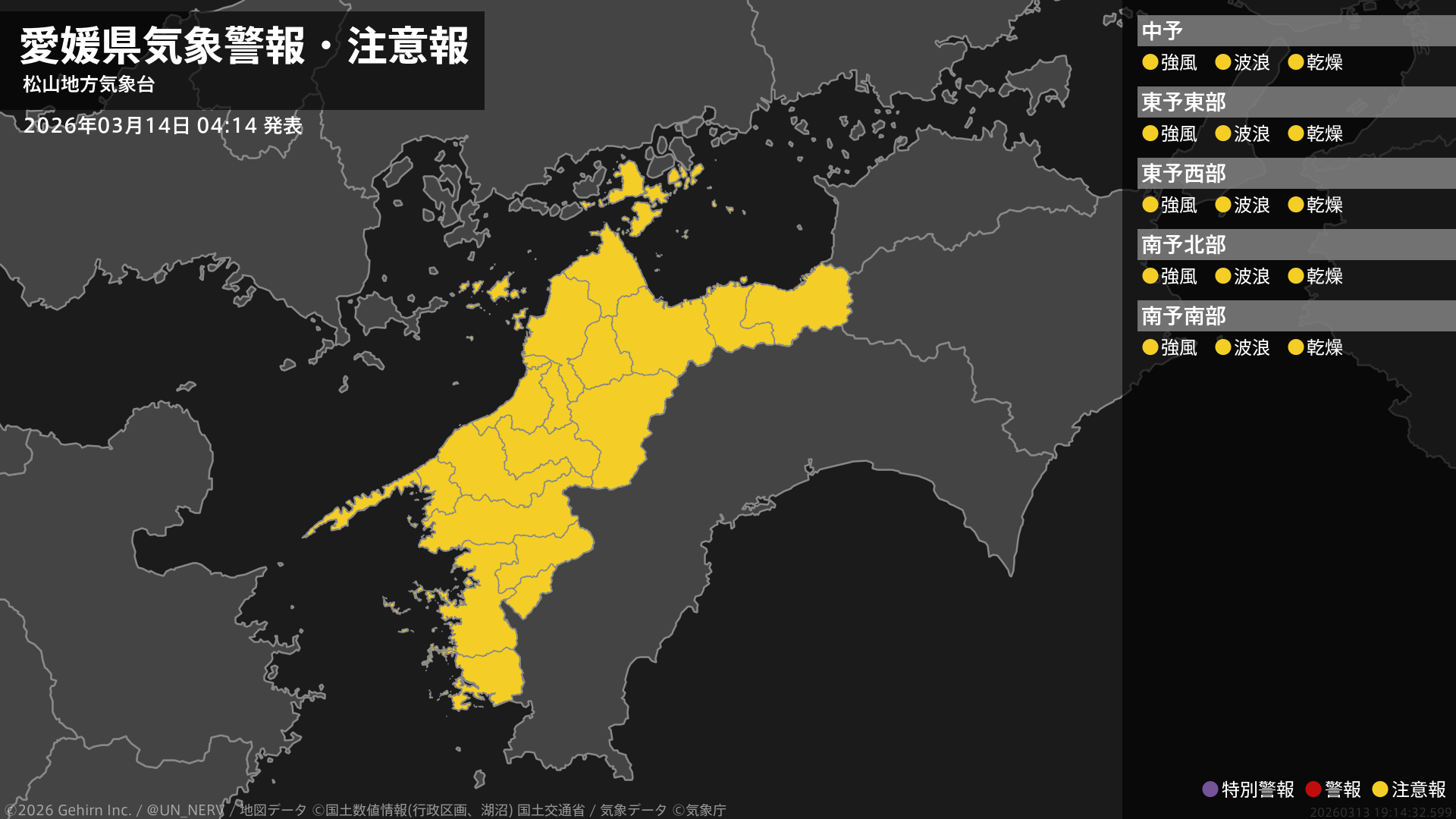 【愛媛県 気象警報・注意報 2026年03月14日 04:14】中予、東予では14日昼前まで、南予では14日夕方まで、強風や高波に注意してください。愛媛県では、15日まで空気の乾燥した状態が続くため、火の取り扱いに注意してください。#気象警報注意報 #愛媛県