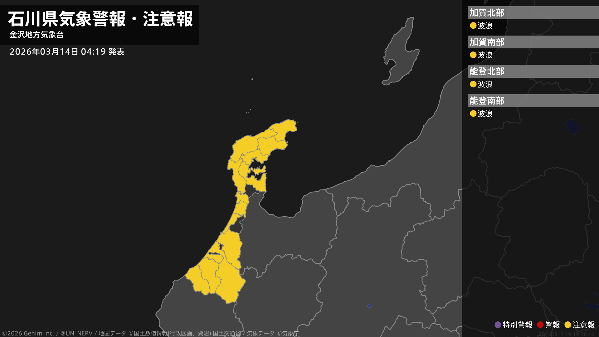 【石川県 気象警報・注意報 2026年03月14日 04:19】加賀では14日昼前まで、能登では14日夜のはじめ頃まで、高波に注意してください。#気象警報注意報 #石川県