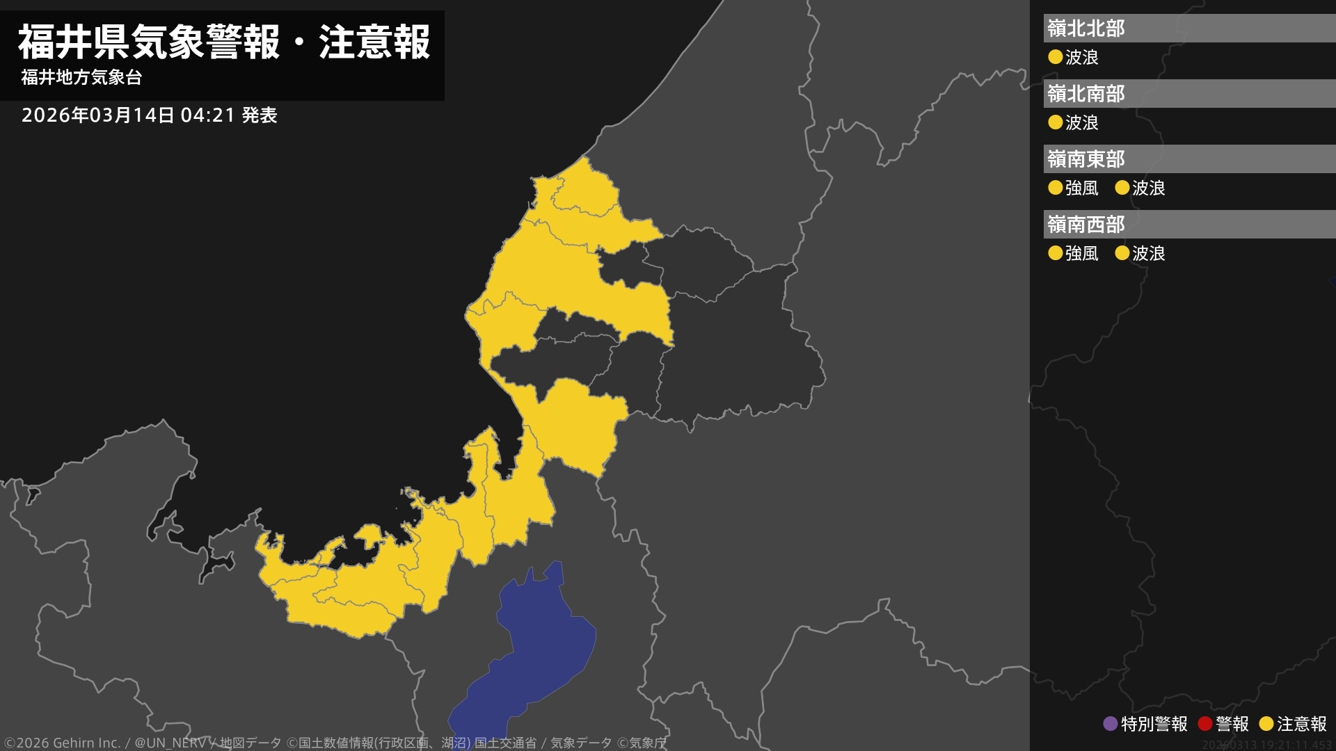 【福井県 気象警報・注意報 2026年03月14日 04:21】嶺南では、14日夕方まで強風に注意してください。福井県では、14日昼前まで高波に注意してください。#気象警報注意報 #福井県