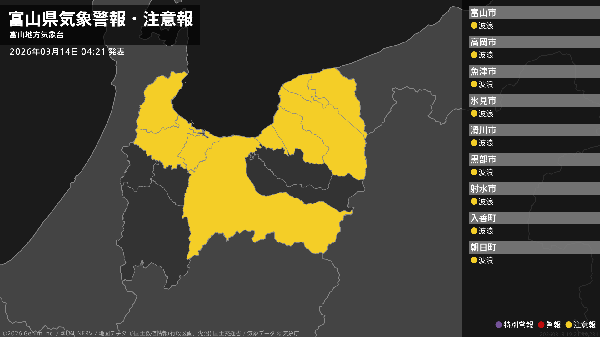 【富山県 気象警報・注意報 2026年03月14日 04:21】富山県では、14日夜のはじめ頃まで高波に注意してください。#気象警報注意報 #富山県
