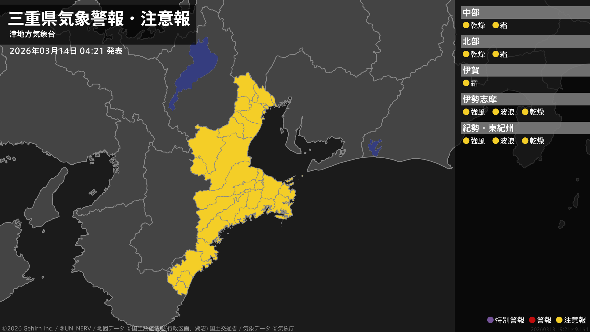 【三重県 気象警報・注意報 2026年03月14日 04:21】南部では、強風や高波に注意してください。三重県では、空気の乾燥した状態が続くため、火の取り扱いに注意してください。北中部では、霜に対する農作物の管理に注意してください。#気象警報注意報 #三重県
