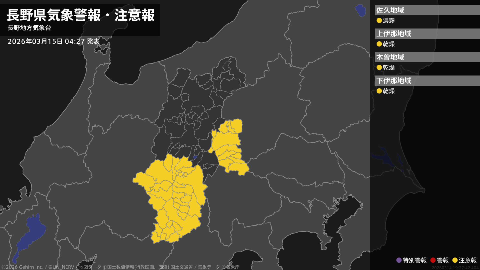 【長野県 気象警報・注意報 2026年03月15日 04:27】中部では、15日昼前まで濃霧による視程障害に注意してください。南部では、16日まで空気の乾燥した状態が続くため、火の取り扱いに注意してください。#気象警報注意報 #長野県