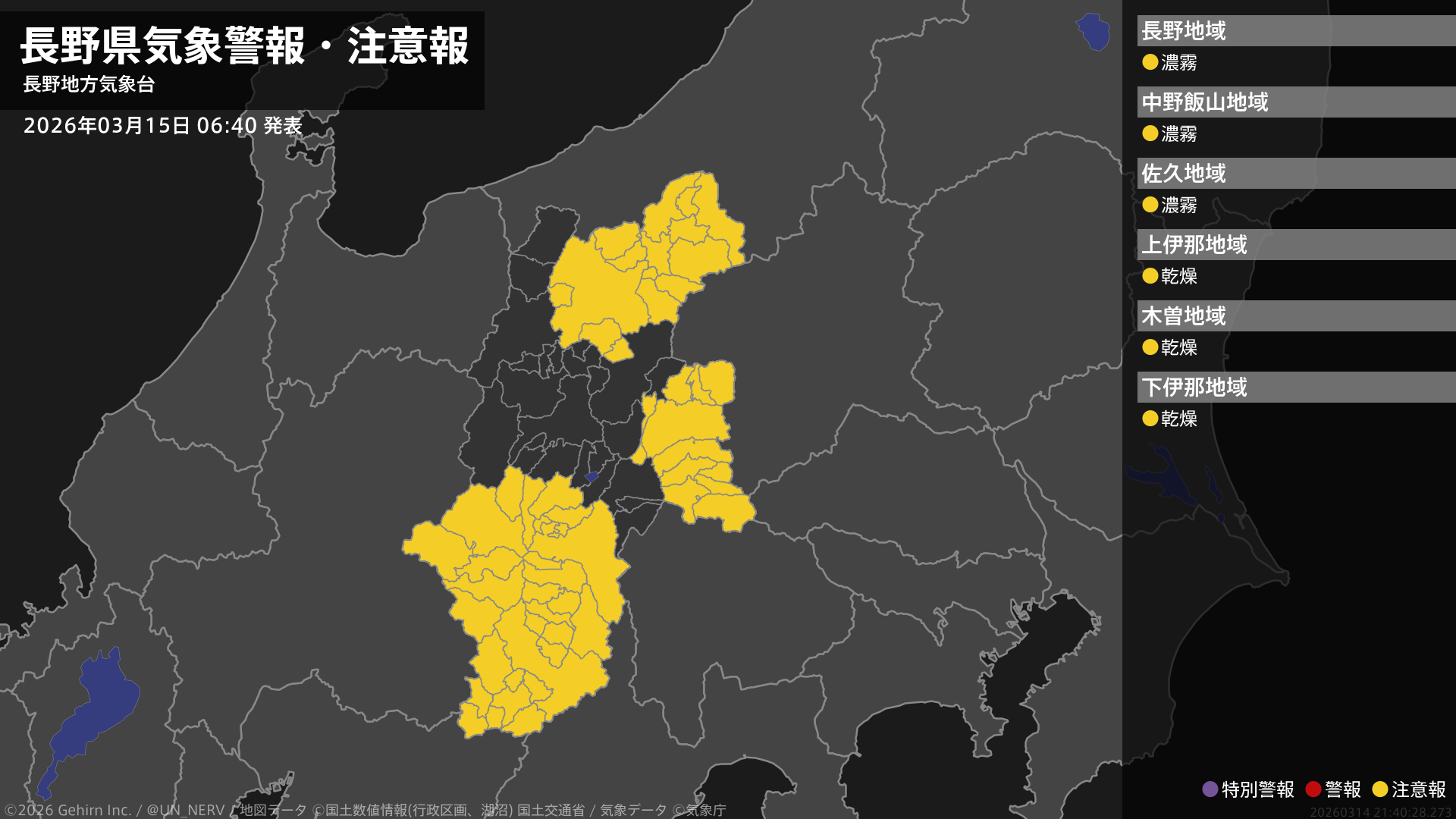 【長野県 気象警報・注意報 2026年03月15日 06:40】北部、中部では、15日昼前まで濃霧による視程障害に注意してください。南部では、16日まで空気の乾燥した状態が続くため、火の取り扱いに注意してください。#気象警報注意報 #長野県