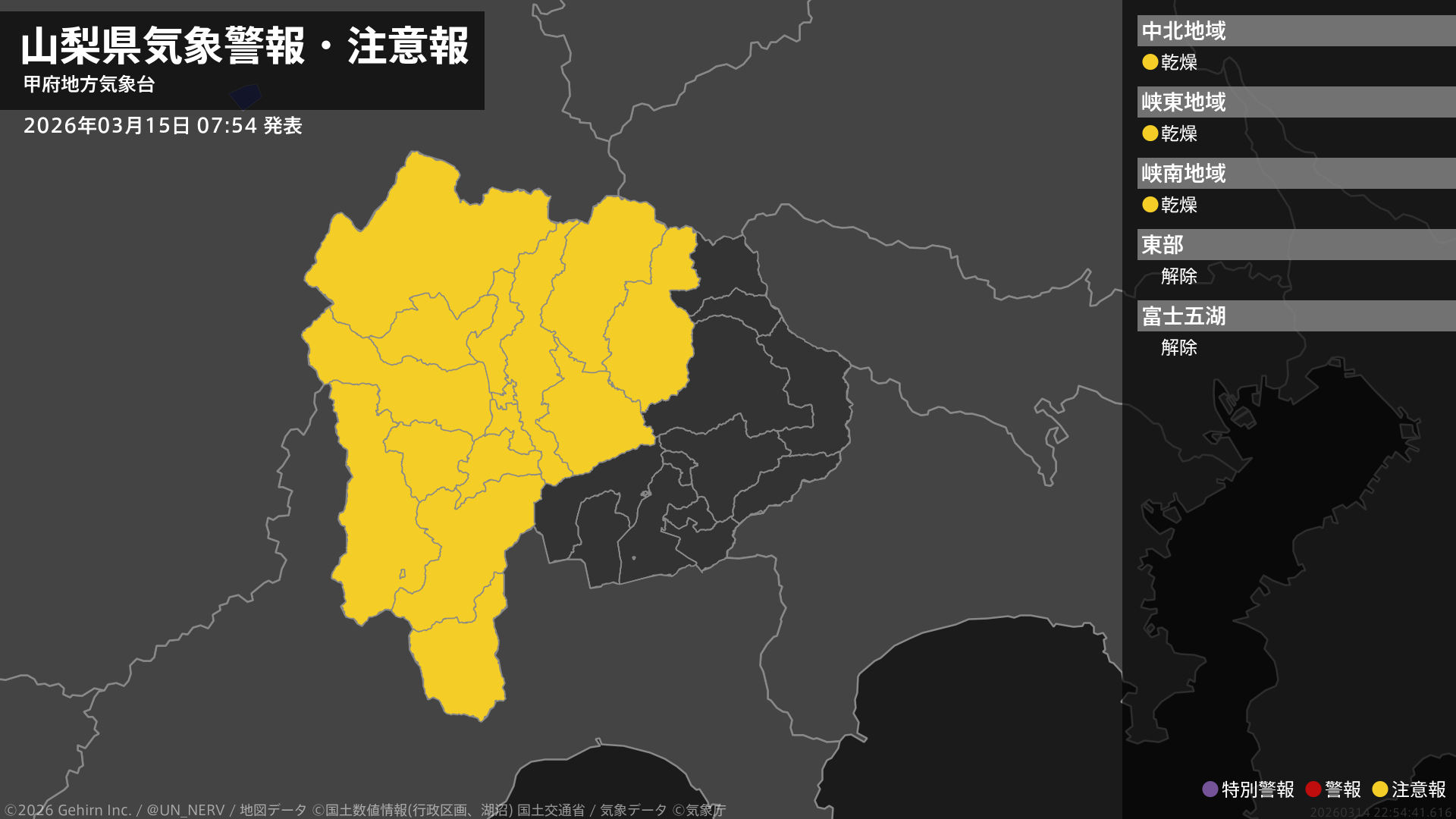 【山梨県 気象警報・注意報 2026年03月15日 07:54】