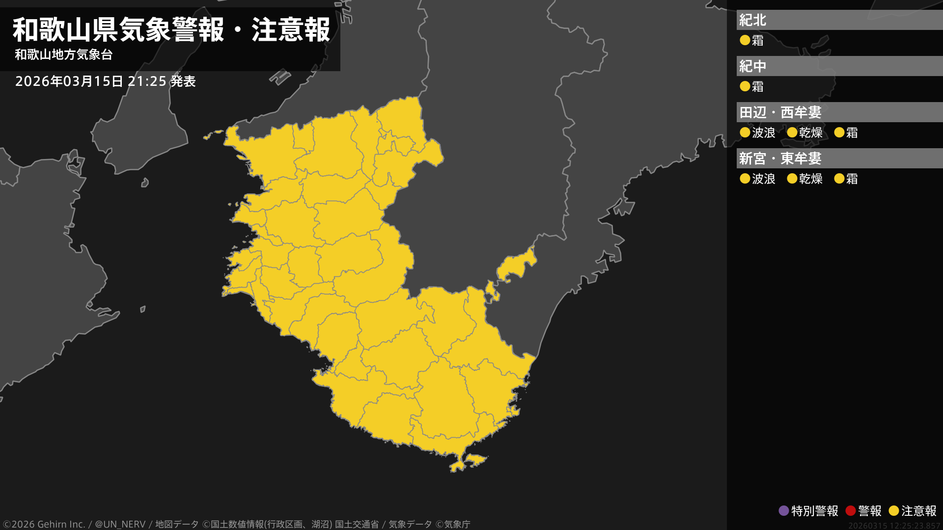 【和歌山県 気象警報・注意報 2026年03月15日 21:25】