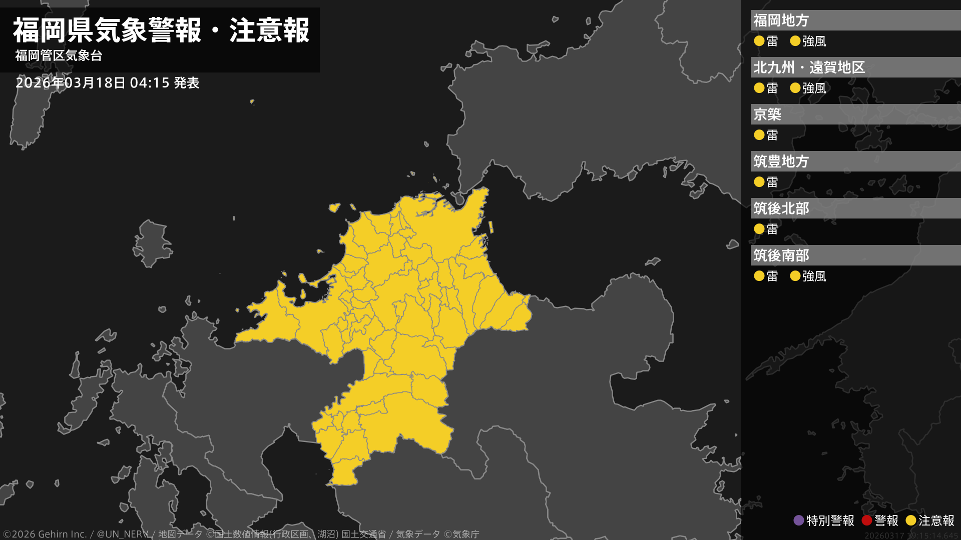【福岡県 気象警報・注意報 2026年03月18日 04:15】福岡、北九州、筑後地方では、強風に注意してください。福岡県では、急な強い雨や落雷に注意してください。#気象警報注意報 #福岡県