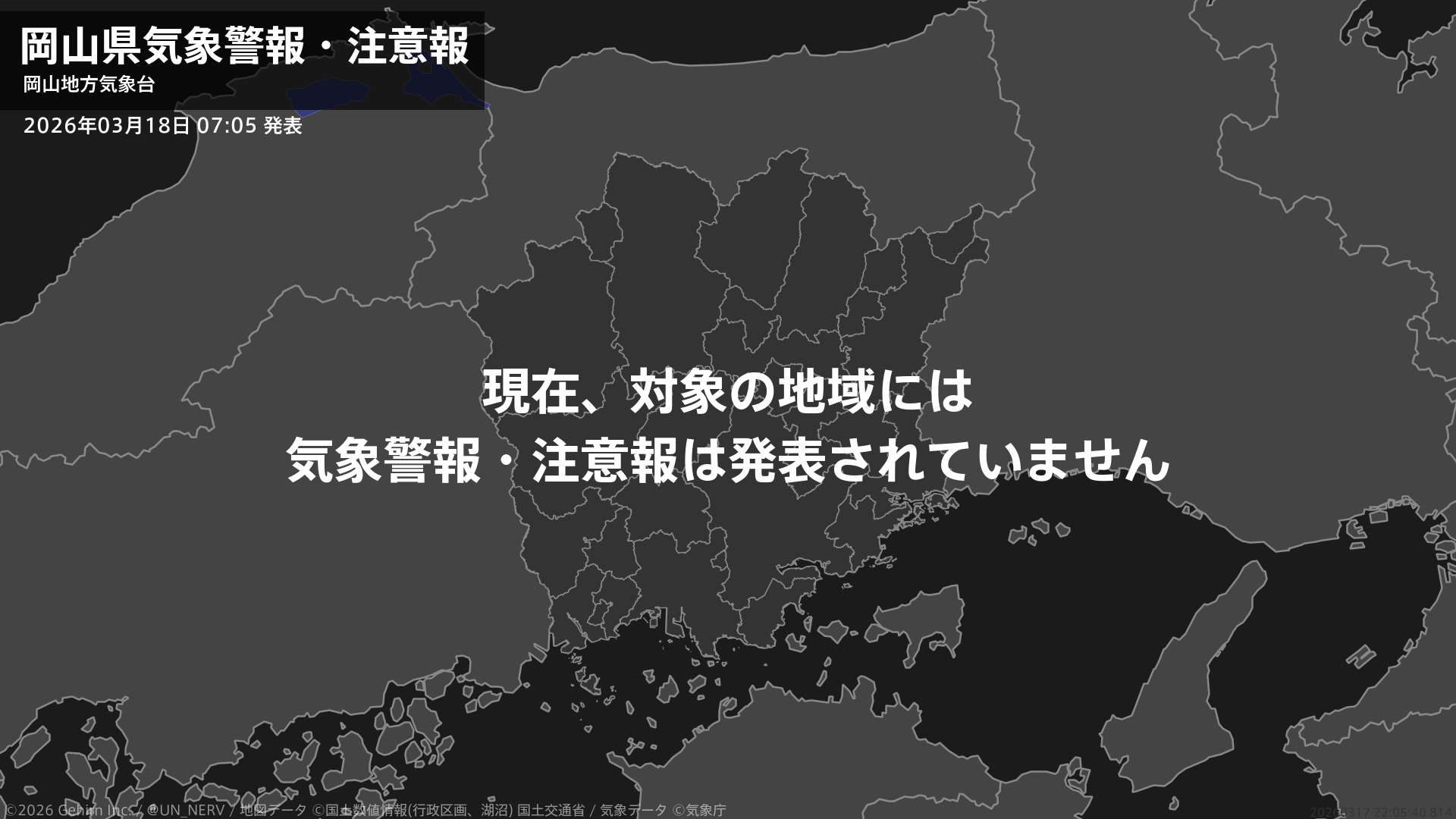 【岡山県 気象警報・注意報 2026年03月18日 07:05】注意報を解除します。#気象警報注意報 #岡山県