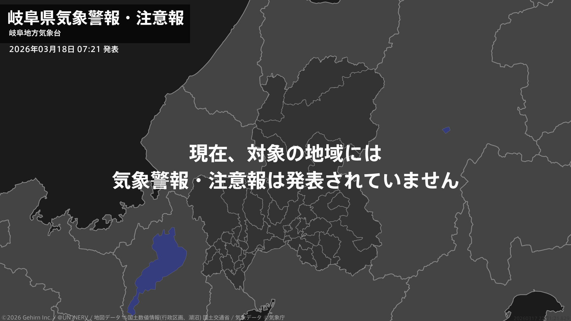 【岐阜県 気象警報・注意報 2026年03月18日 07:21】注意報を解除します。#気象警報注意報 #岐阜県