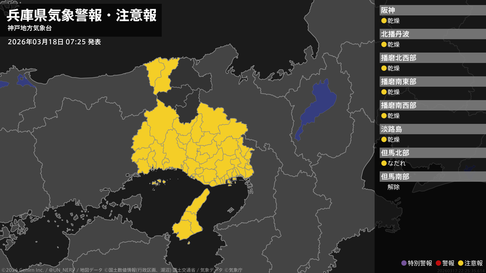 【兵庫県 気象警報・注意報 2026年03月18日 07:25】南部では、18日まで空気の乾燥した状態が続くため、火の取り扱いに注意してください。北部では、19日までなだれに注意してください。#気象警報注意報 #兵庫県