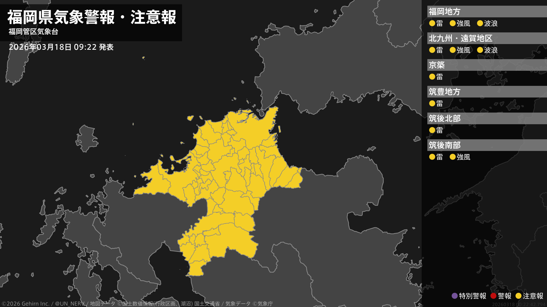 【福岡県 気象警報・注意報 2026年03月18日 09:22】福岡、北九州、筑後地方では、強風に注意してください。福岡、北九州地方では、高波に注意してください。福岡県では、急な強い雨や落雷に注意してください。#気象警報注意報 #福岡県