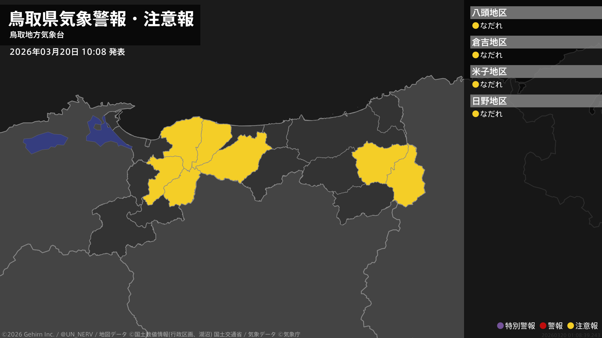 【鳥取県 気象警報・注意報 2026年03月20日 10:08】鳥取県では、21日までなだれに注意してください。#気象警報注意報 #鳥取県