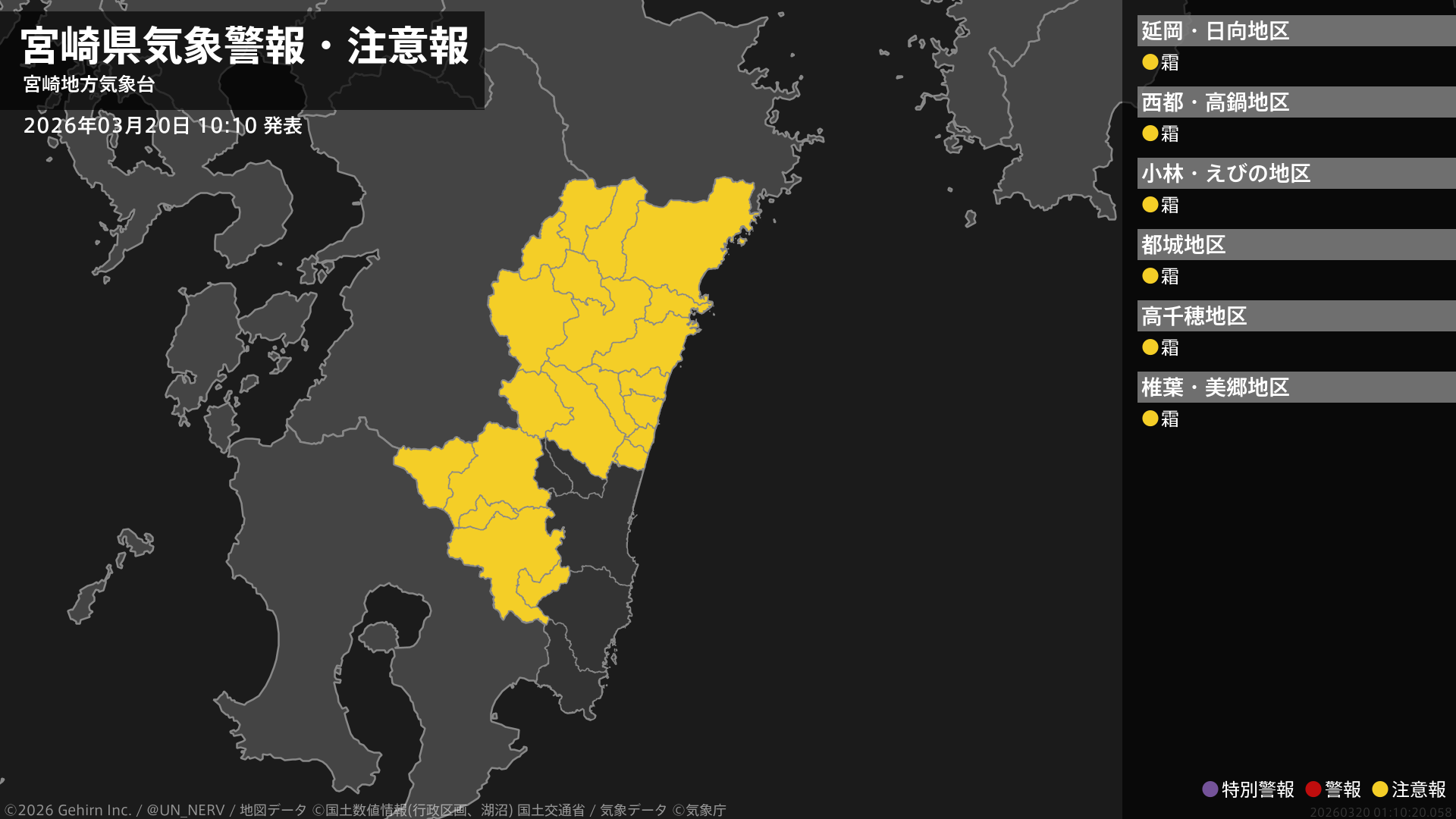 【宮崎県 気象警報・注意報 2026年03月20日 10:10】北部平野部、南部山沿い、北部山沿いでは、21日朝は霜に対する農作物の管理に注意してください。#気象警報注意報 #宮崎県