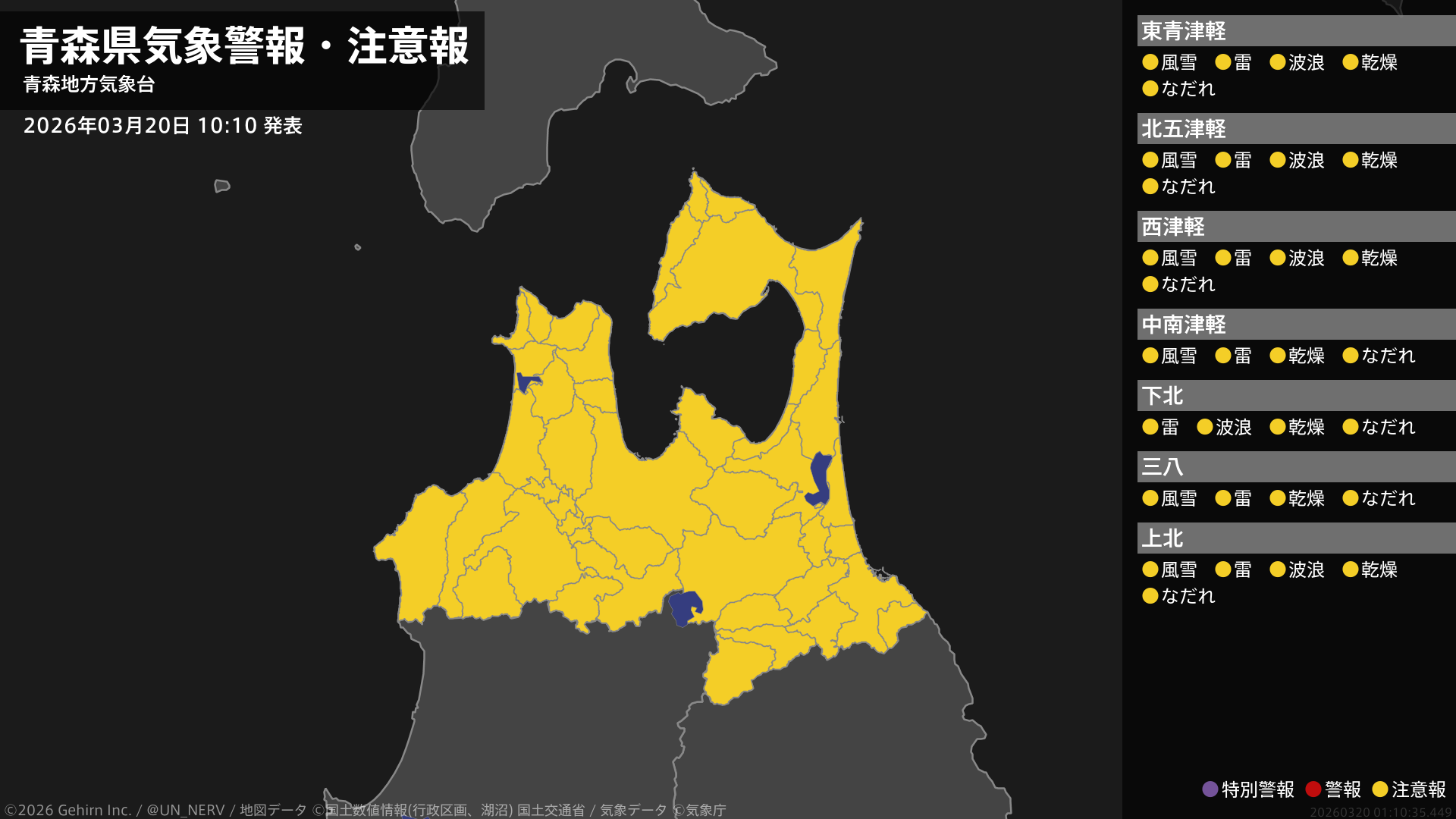 【青森県 気象警報・注意報 2026年03月20日 10:10】津軽、三八上北では、風雪に注意してください。青森県では、高波や竜巻などの激しい突風、急な強い雨、落雷、乾燥、なだれに注意してください。#気象警報注意報 #青森県