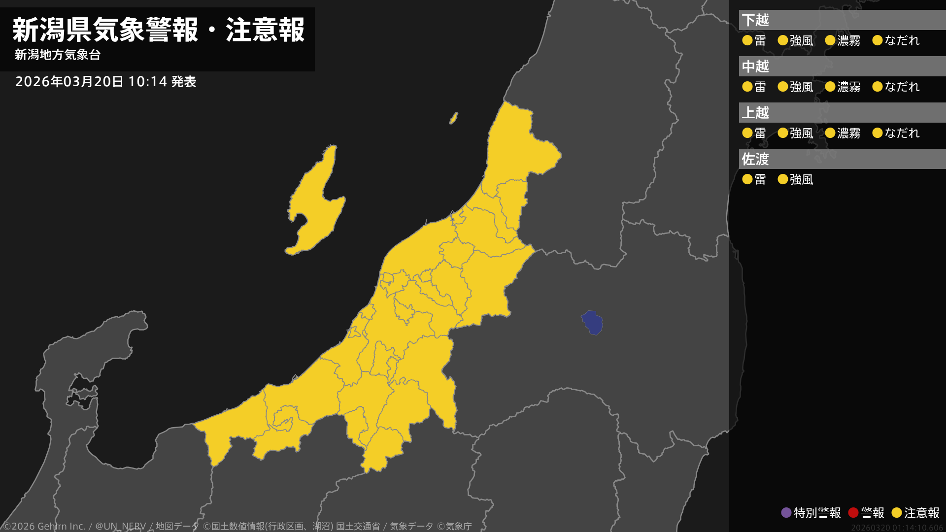 【新潟県 気象警報・注意報 2026年03月20日 10:14】新潟県では、強風や竜巻などの激しい突風、急な強い雨、落雷に注意してください。下越、中越、上越では、濃霧による視程障害やなだれに注意してください。#気象警報注意報 #新潟県