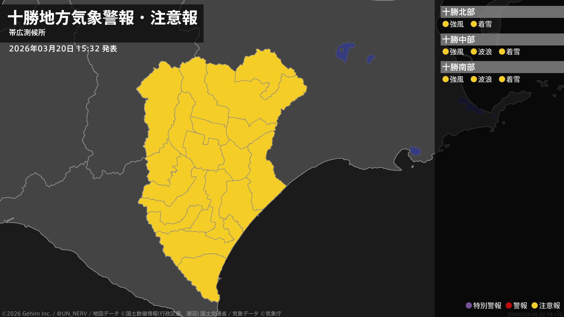 【十勝地方 気象警報・注意報 2026年03月20日 15:32】十勝地方では、21日未明から強風に、21日明け方から高波に、21日未明から21日昼前まで電線等への着雪に注意してください。#気象警報注意報 #十勝地方