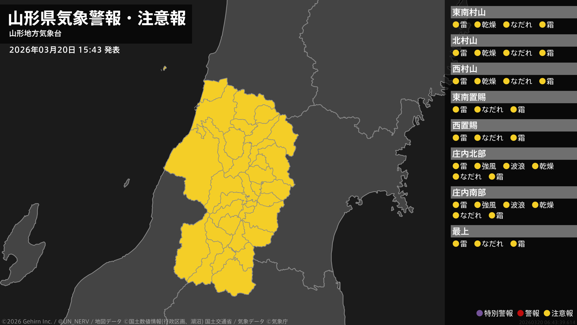 【山形県 気象警報・注意報 2026年03月20日 15:43】庄内では強風や高波に、山形県では竜巻などの激しい突風や落雷、なだれ、霜に対する農作物の管理に、村山、庄内では空気の乾燥した状態が続くため、火の取り扱いに注意してください。#気象警報注意報 #山形県