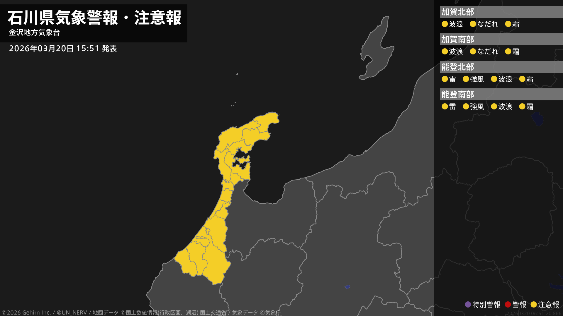 【石川県 気象警報・注意報 2026年03月20日 15:51】能登では、強風や急な強い雨、落雷に注意してください。石川県では、高波や霜に対する農作物の管理に注意してください。加賀では、なだれに注意してください。#気象警報注意報 #石川県