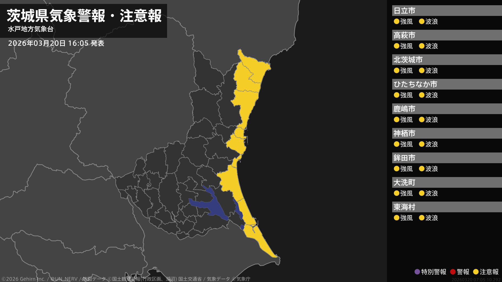 【茨城県 気象警報・注意報 2026年03月20日 16:05】茨城県では、21日未明から21日朝まで強風や高波に注意してください。#気象警報注意報 #茨城県