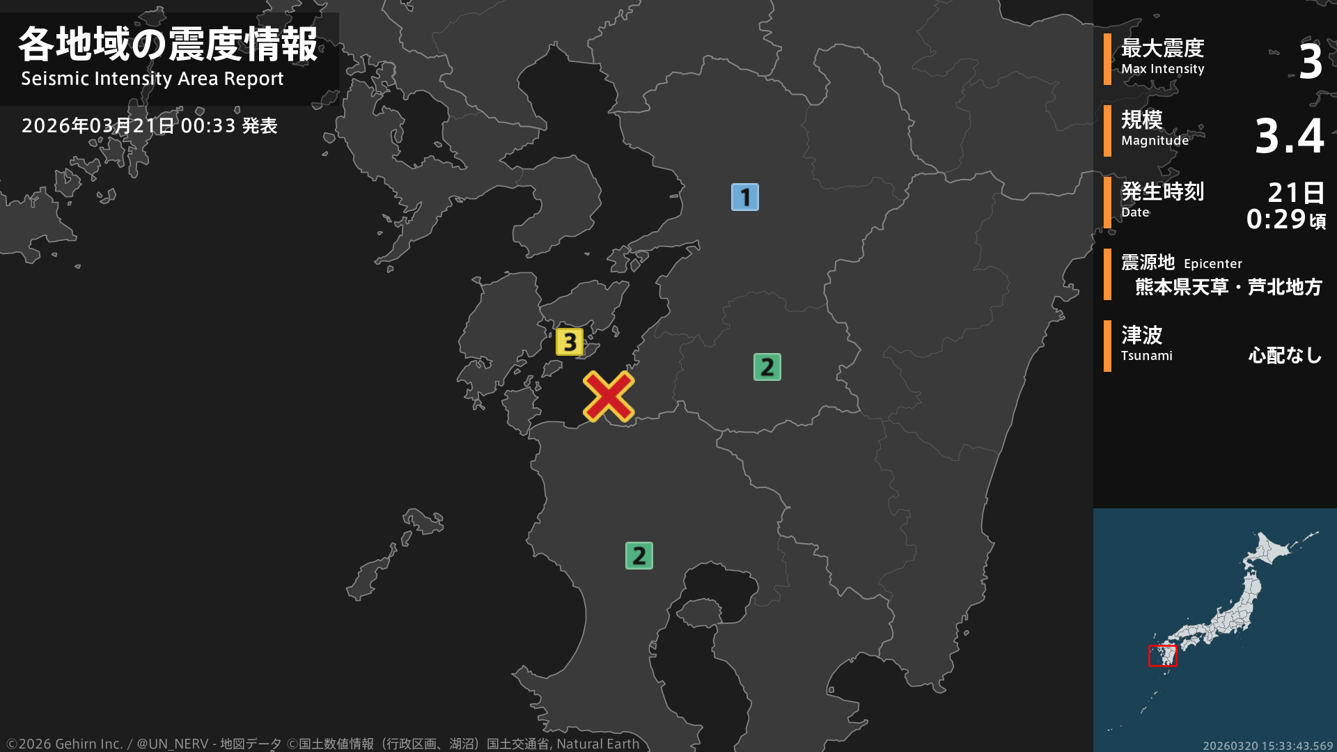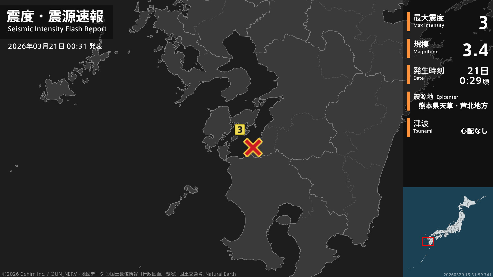 0時29分頃、熊本県天草・芦北地方を震源とする地震がありました。地震の規模はM3.5程度、最大震度3程度と推定されています。この情報は気象庁の予報に基づく推定です。情報は誤差を含む場合があります。