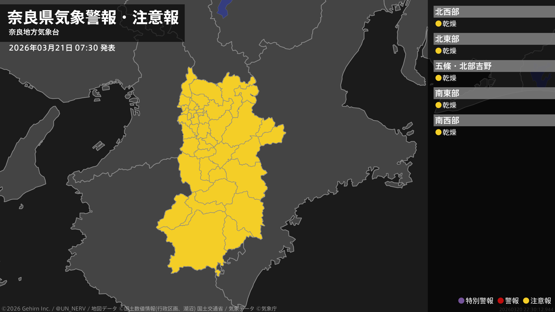 【奈良県 気象警報・注意報 2026年03月21日 07:30】奈良県では、22日まで空気の乾燥した状態が続くため、火の取り扱いに注意してください。#気象警報注意報 #奈良県