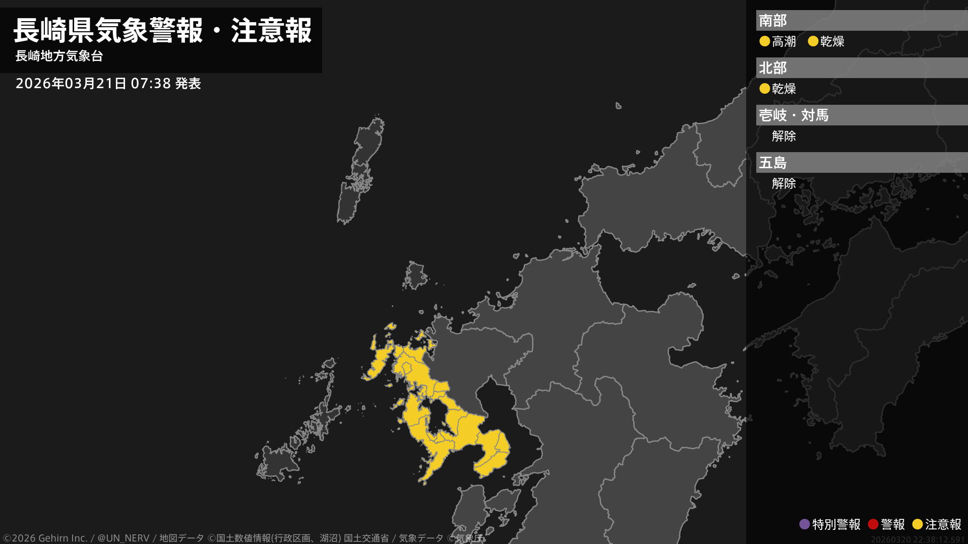 【長崎県 気象警報・注意報 2026年03月21日 07:38】南部では、22日まで高潮に注意してください。南部、北部では、21日まで空気の乾燥した状態が続くため、火の取り扱いに注意してください。#気象警報注意報 #長崎県