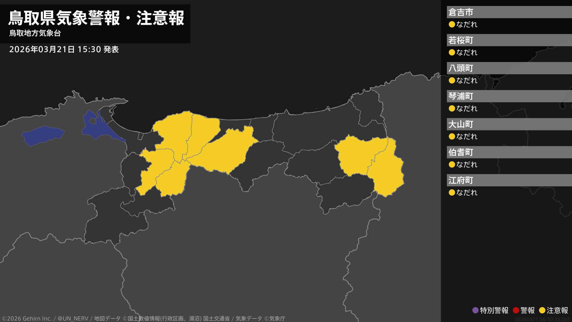 【鳥取県 気象警報・注意報 2026年03月21日 15:30】