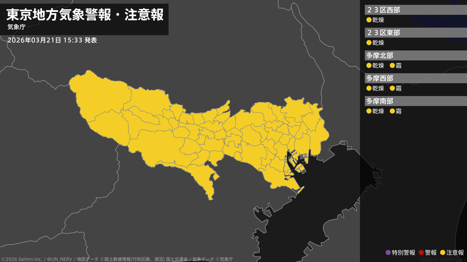 【東京都 気象警報・注意報 2026年03月21日 15:33】