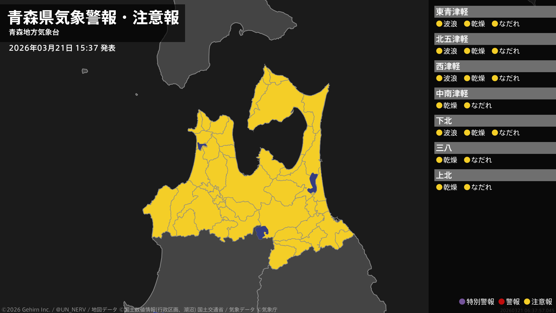 【青森県 気象警報・注意報 2026年03月21日 15:37】