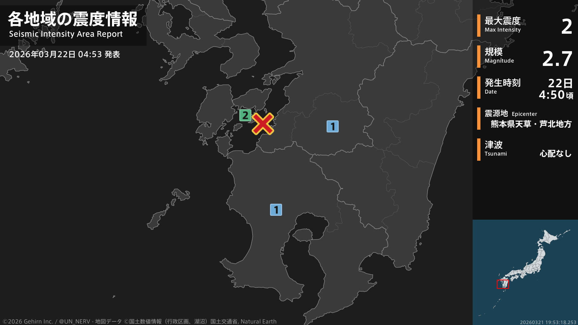 【地震情報 2026年3月22日】4時50分頃、熊本県天草・芦北地方を震源とする地震がありました。震源の深さは約10km、地震の規模はM2.7、最大震度2を熊本県で観測しています。この地震による津波の心配はありません。#地震 #熊本県 #鹿児島県