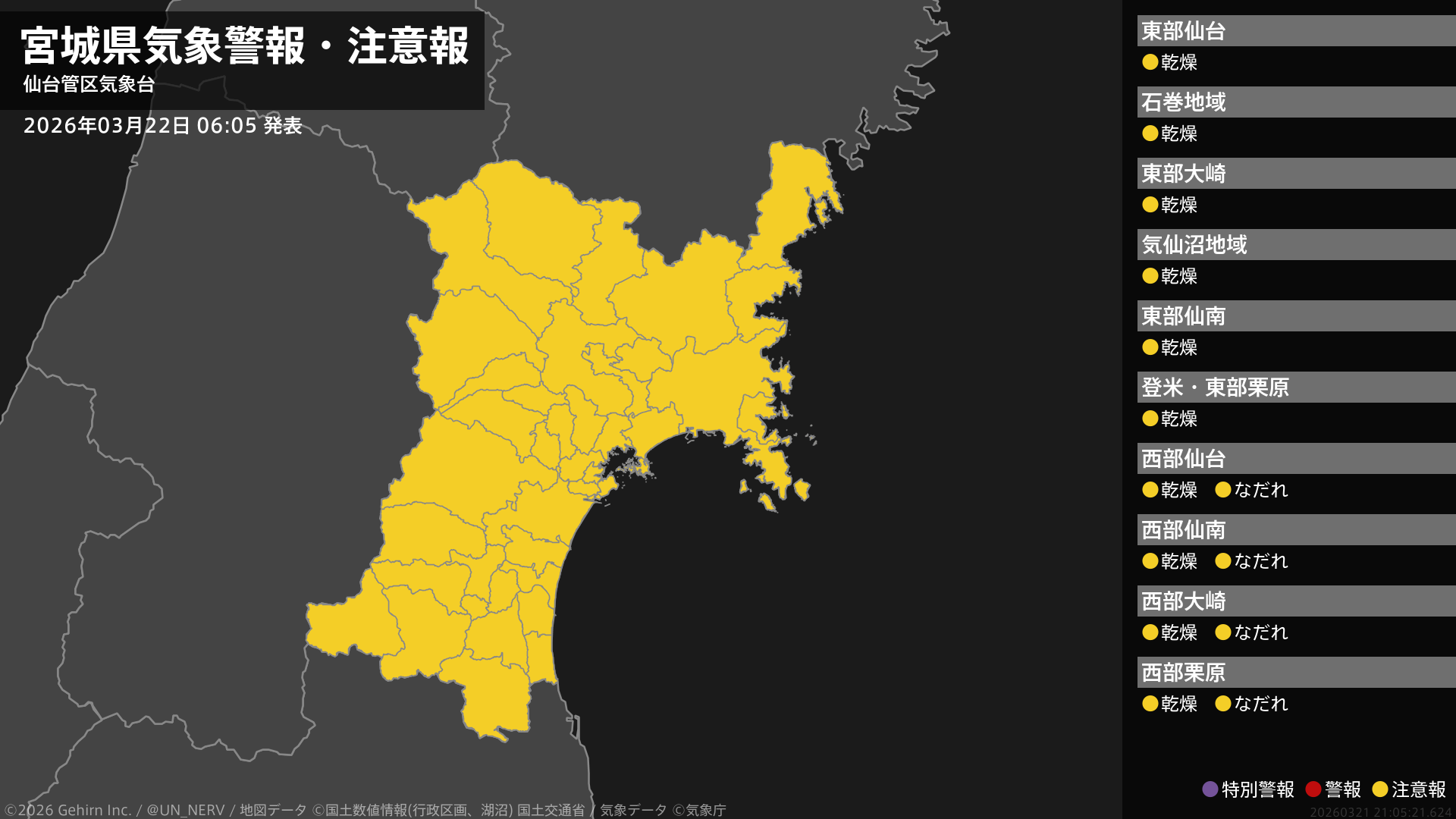 【宮城県 気象警報・注意報 2026年03月22日 06:05】宮城県では、23日まで空気の乾燥した状態が続くため、火の取り扱いに注意してください。西部では、ここしばらくなだれに注意してください。#気象警報注意報 #宮城県