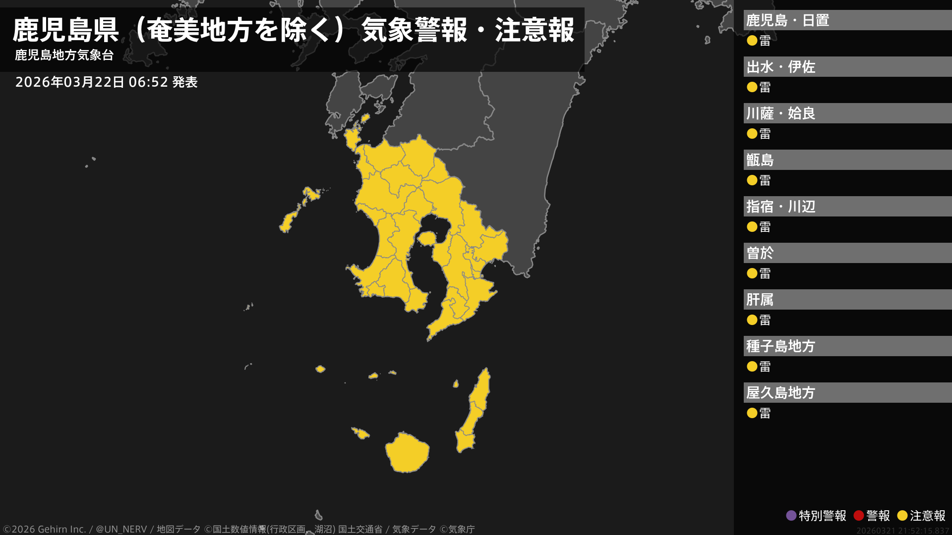 【鹿児島県(奄美地方を除く) 気象警報・注意報 2026年03月22日 06:52】薩摩、大隅地方では22日昼過ぎから22日夜のはじめ頃まで、種子島・屋久島地方では22日昼過ぎから22日夜遅くまで、竜巻などの激しい突風や急な強い雨、落雷に注意してください。#気象警報注意報 #鹿児島県(奄美地方除く)