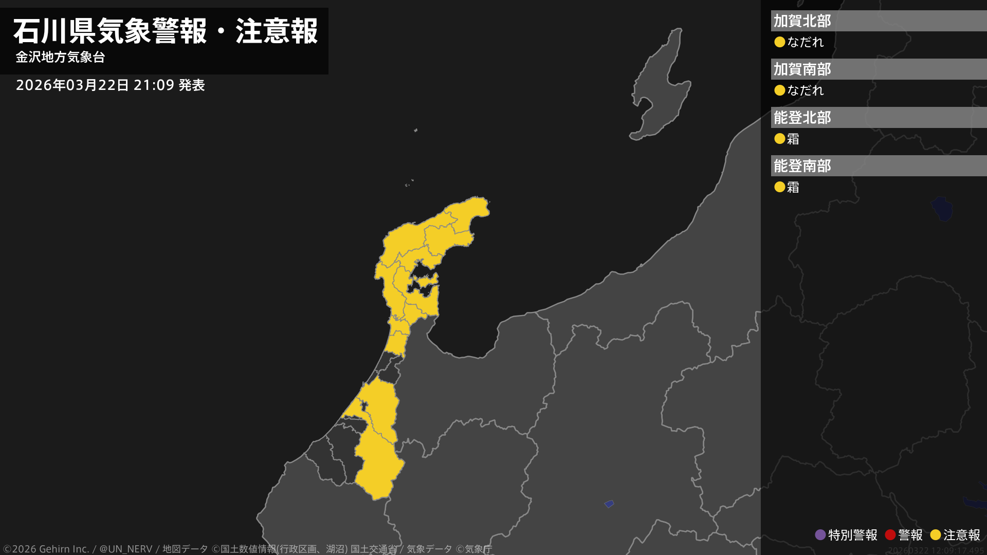 【石川県 気象警報・注意報 2026年03月22日 21:09】加賀では、23日までなだれに注意してください。能登では、23日朝は霜に対する農作物の管理に注意してください。#気象警報注意報 #石川県