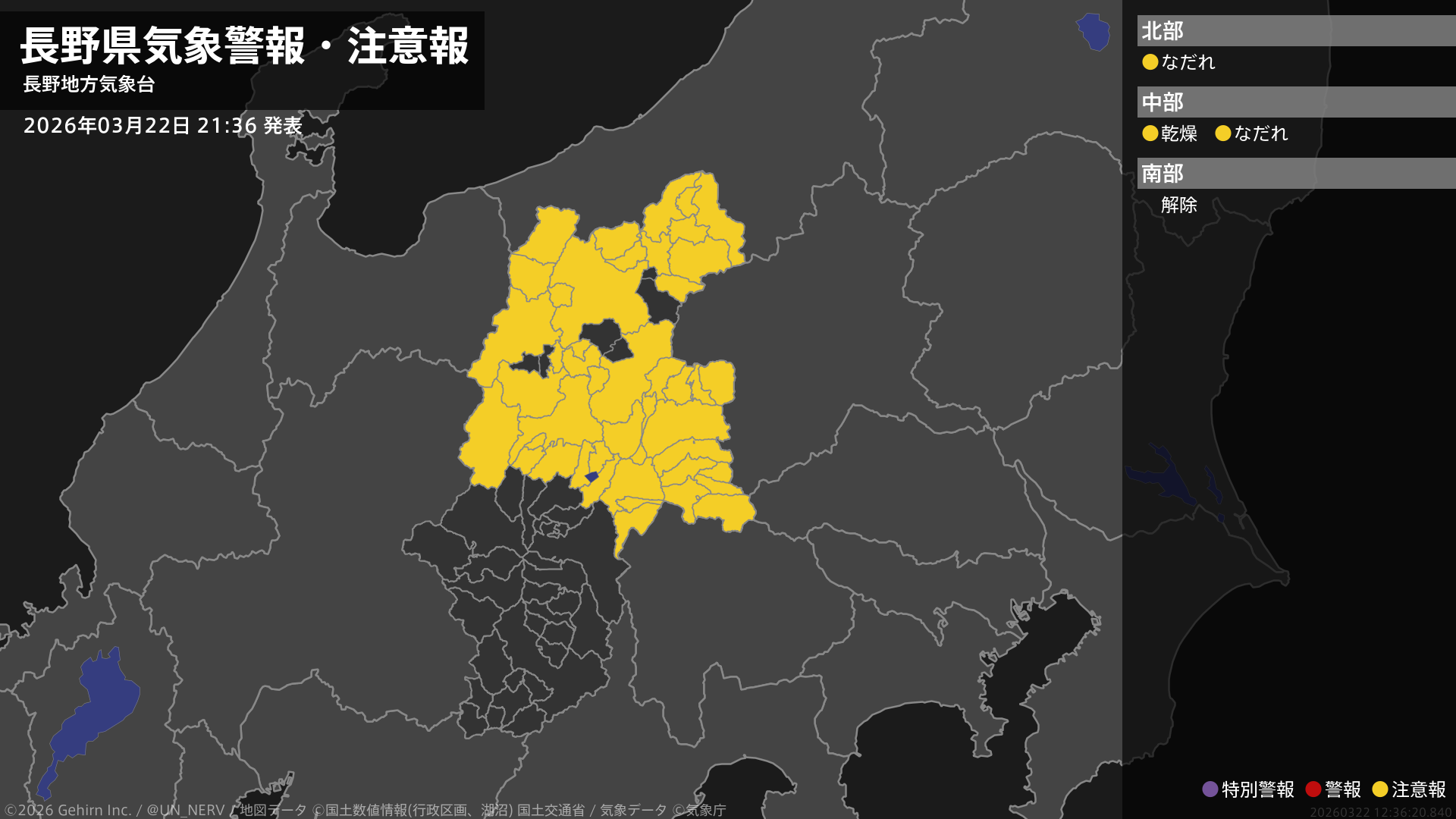 【長野県 気象警報・注意報 2026年03月22日 21:36】中部では、23日まで空気の乾燥した状態が続くため、火の取り扱いに注意してください。北部、中部では、23日までなだれに注意してください。#気象警報注意報 #長野県