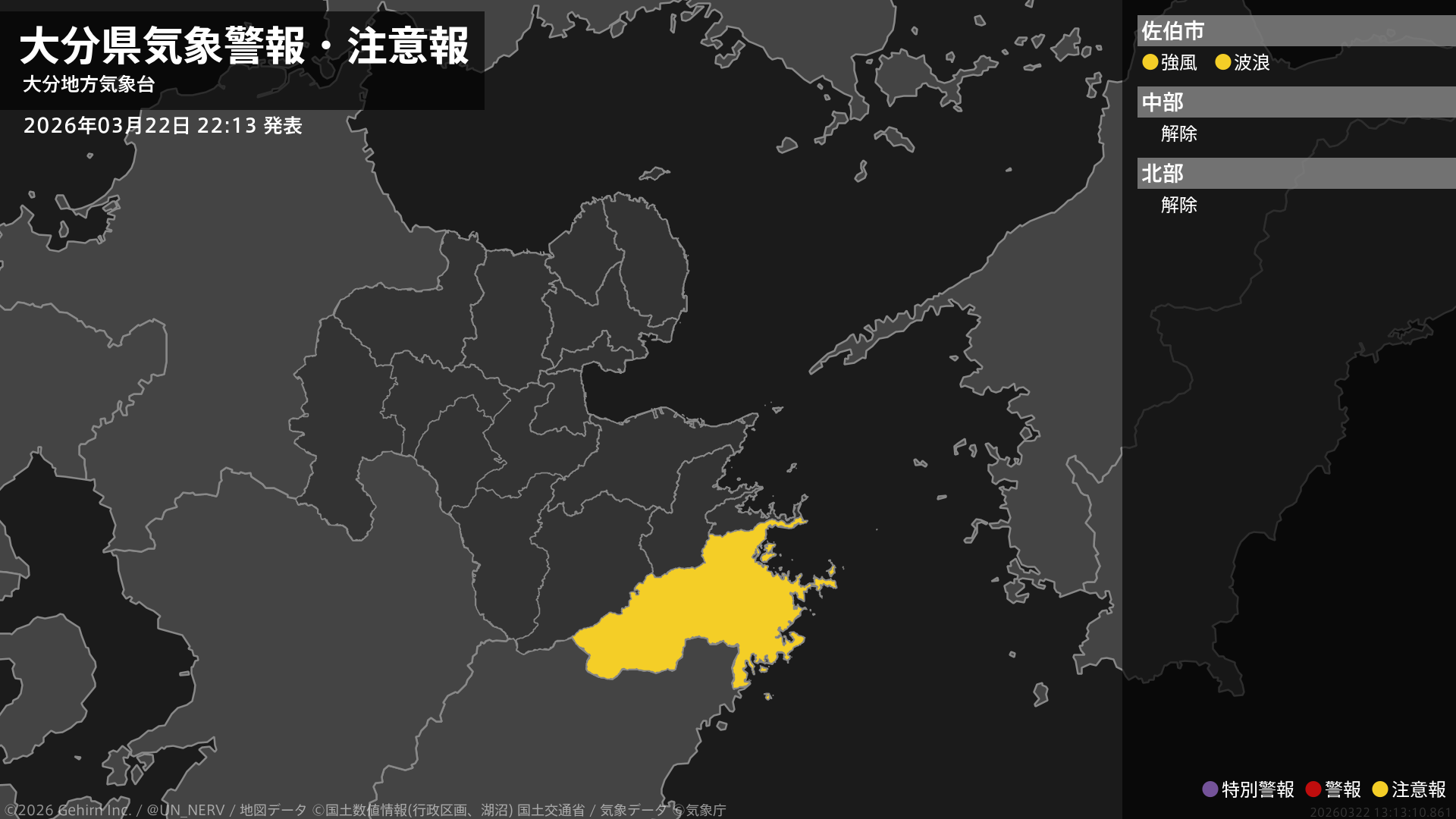 【大分県 気象警報・注意報 2026年03月22日 22:13】南部では、23日明け方まで強風や高波に注意してください。#気象警報注意報 #大分県