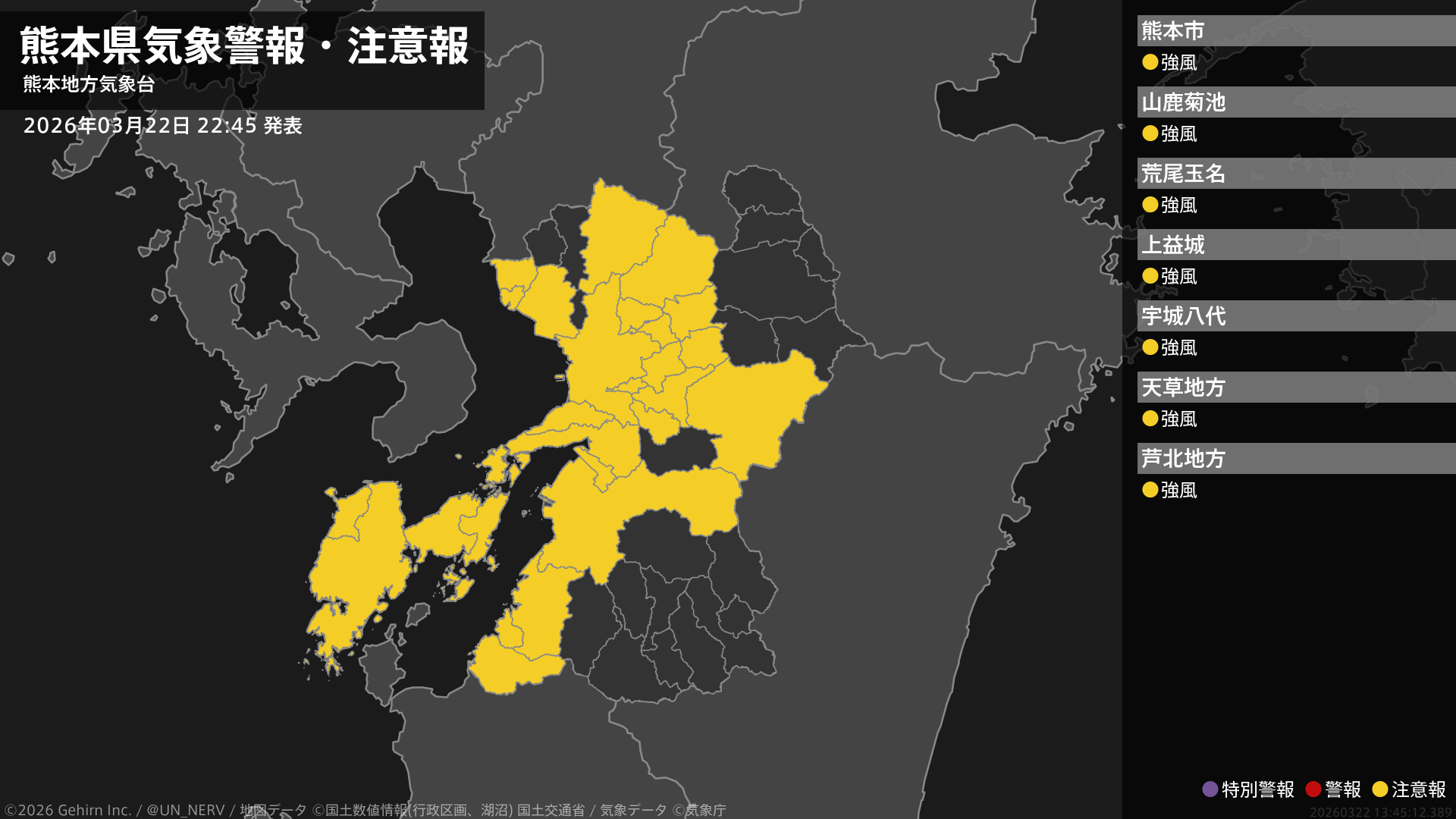 【熊本県 気象警報・注意報 2026年03月22日 22:45】熊本、天草・芦北地方では、23日明け方まで強風に注意してください。#気象警報注意報 #熊本県