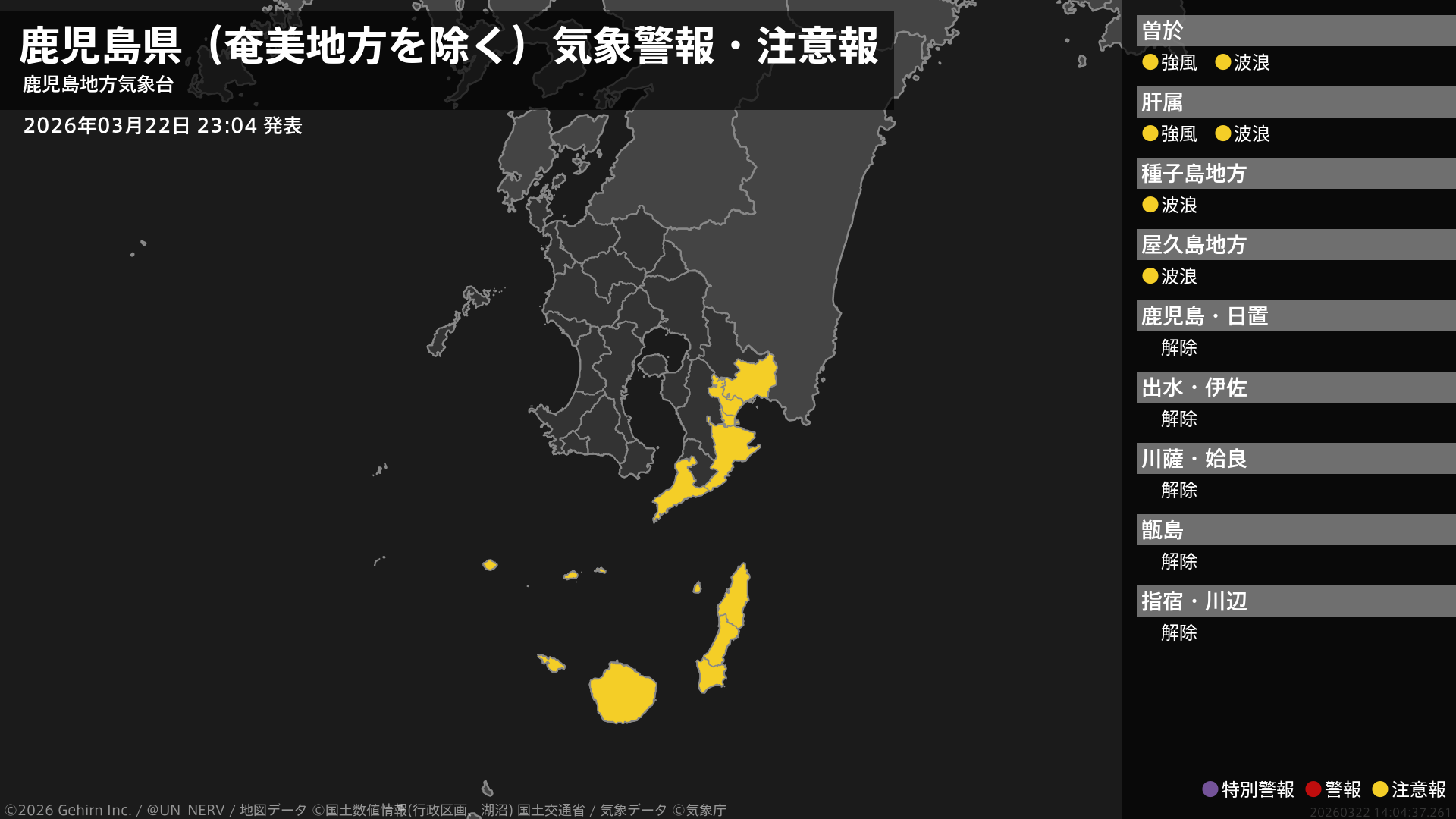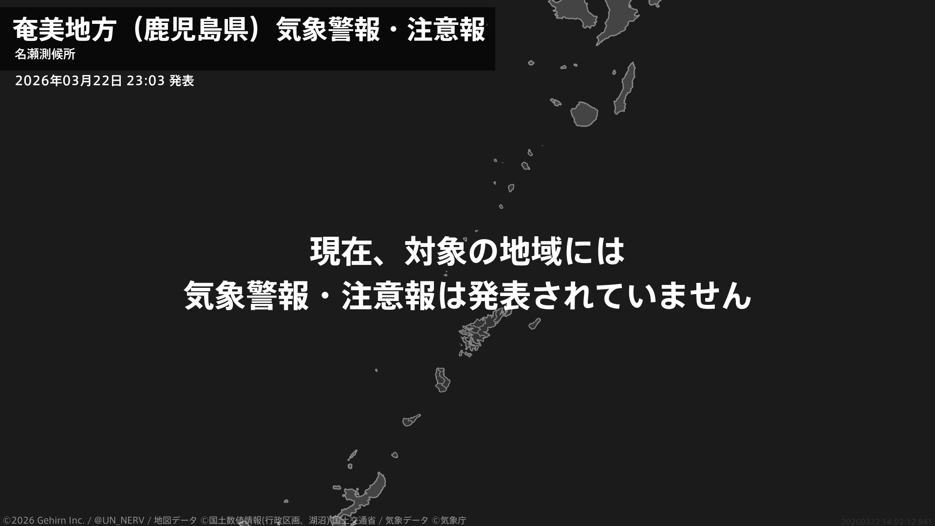 【奄美地方(鹿児島県) 気象警報・注意報 2026年03月22日 23:03】注意報を解除します。#気象警報注意報 #奄美地方