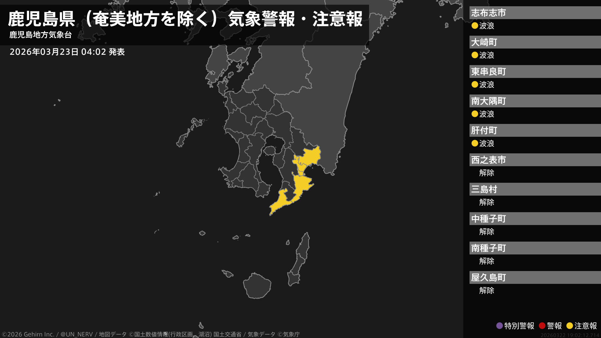 【鹿児島県(奄美地方を除く) 気象警報・注意報 2026年03月23日 04:02】大隅地方では、23日朝まで高波に注意してください。#気象警報注意報 #鹿児島県(奄美地方除く)