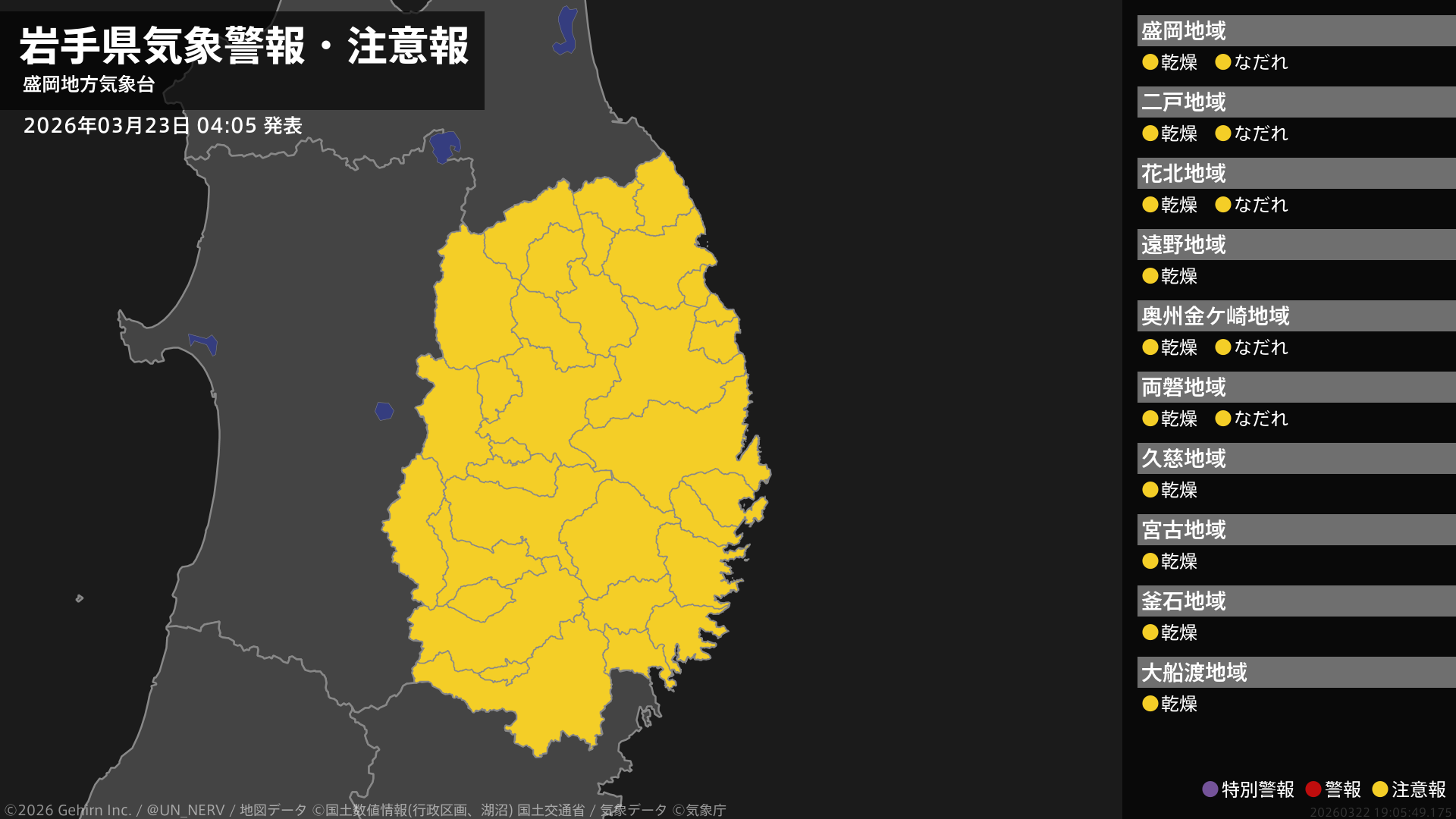 【岩手県 気象警報・注意報 2026年03月23日 04:05】岩手県では、23日まで空気の乾燥した状態が続くため、火の取り扱いに注意してください。内陸では、ここしばらくなだれに注意してください。#気象警報注意報 #岩手県