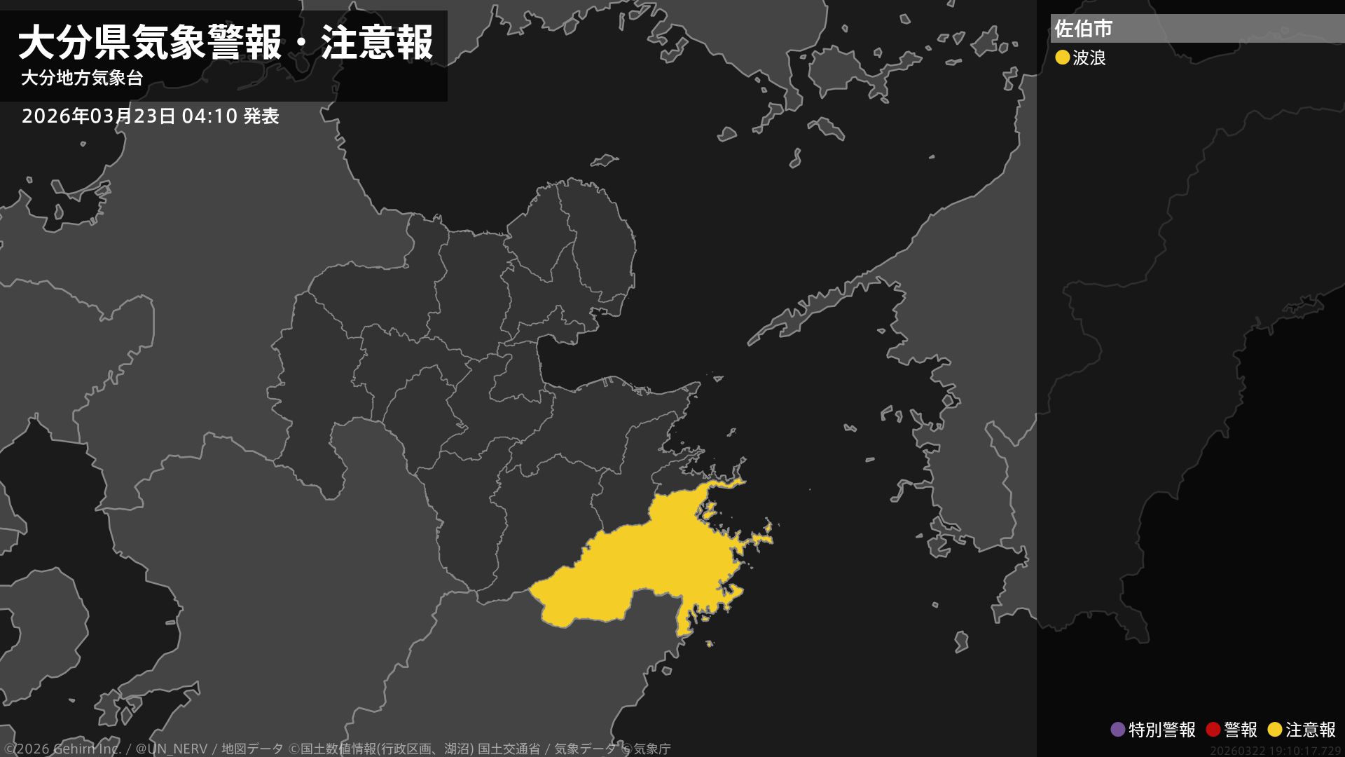 【大分県 気象警報・注意報 2026年03月23日 04:10】南部では、23日昼前まで高波に注意してください。#気象警報注意報 #大分県