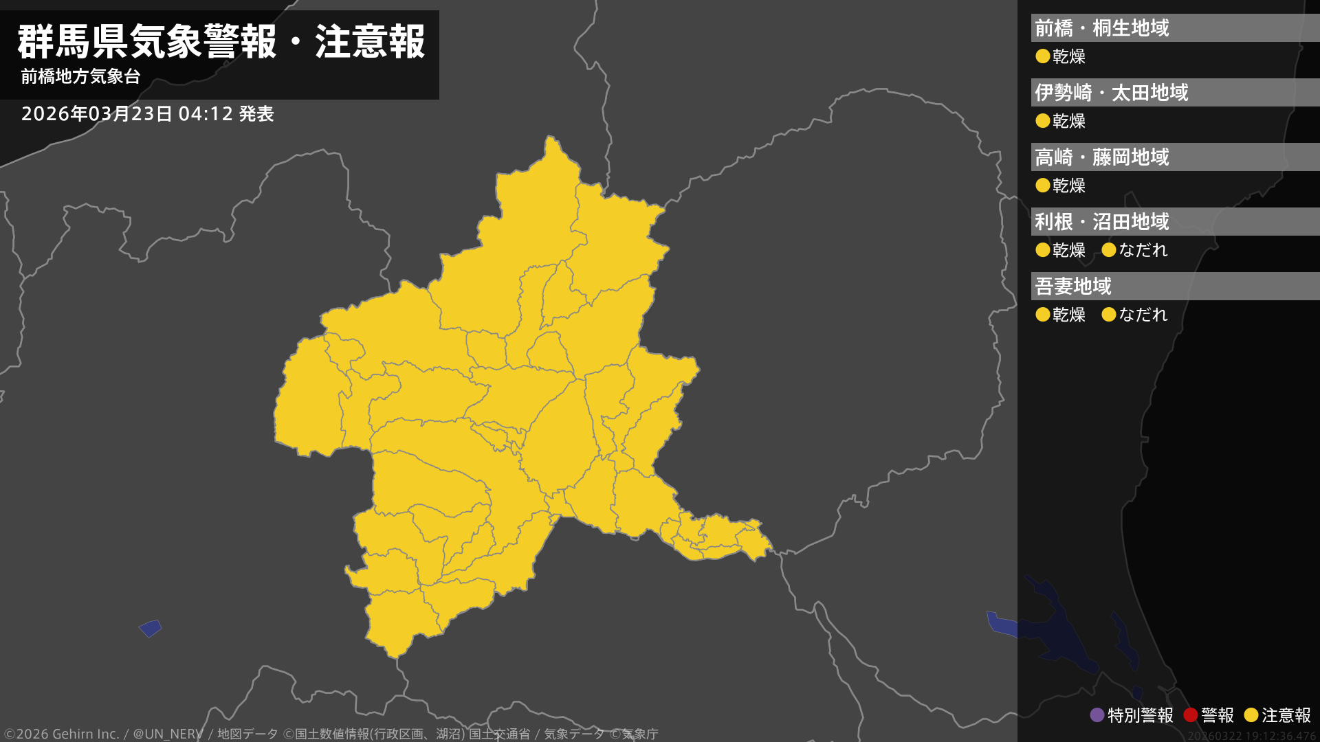 【群馬県 気象警報・注意報 2026年03月23日 04:12】群馬県では、24日まで空気の乾燥した状態が続くため、火の取り扱いに注意してください。北部では、25日までなだれに注意してください。#気象警報注意報 #群馬県