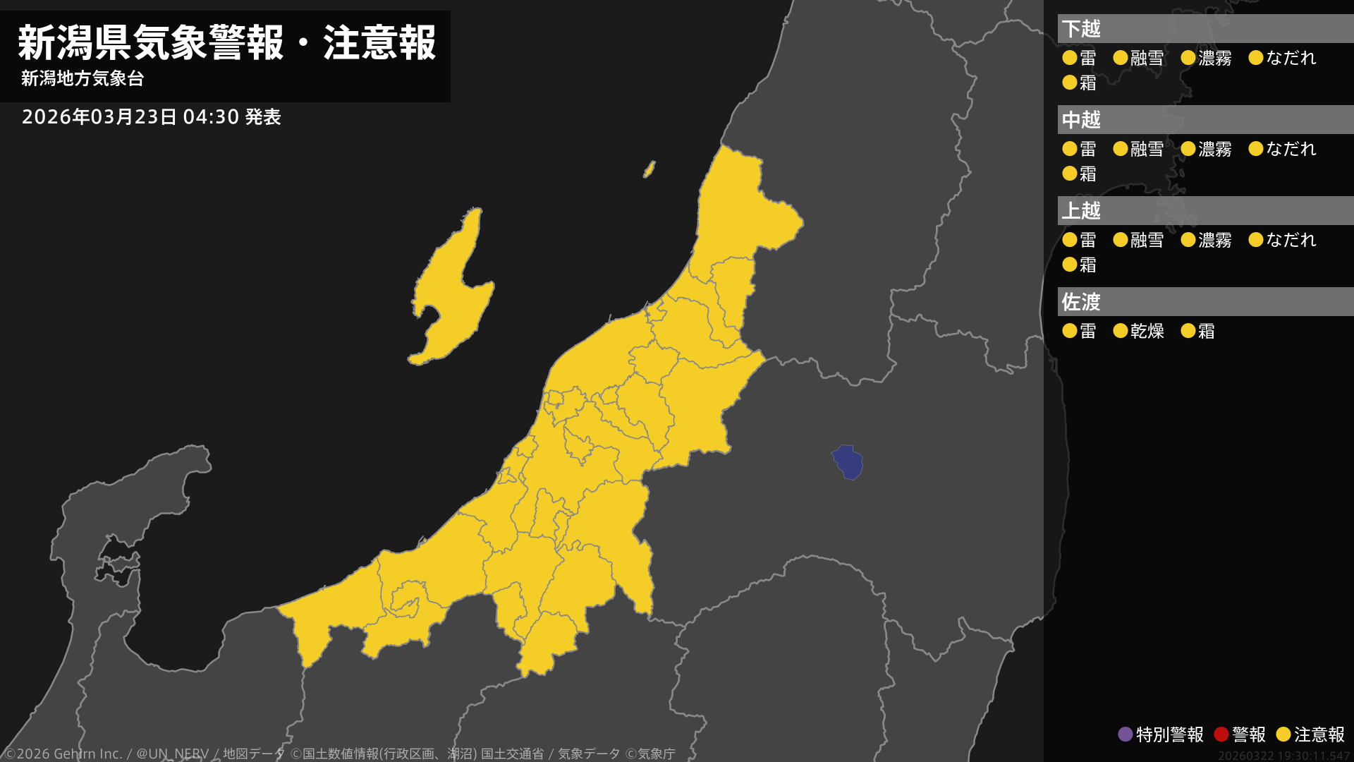 【新潟県 気象警報・注意報 2026年03月23日 04:30】新潟県では、急な強い雨や落雷、融雪による土砂災害、濃霧による視程障害、空気の乾燥した状態が続くため、火の取り扱い、なだれ、霜に対する農作物の管理に注意してください。#気象警報注意報 #新潟県