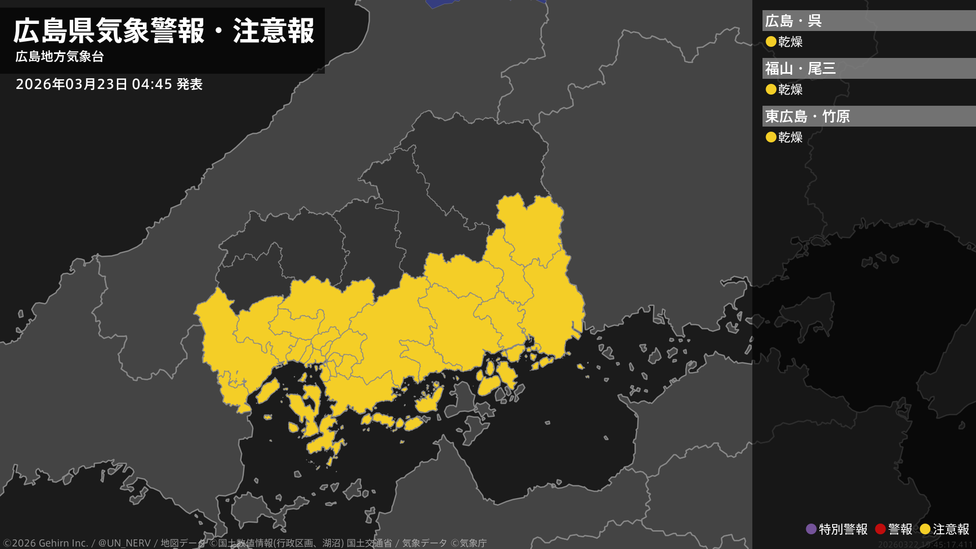 【広島県 気象警報・注意報 2026年03月23日 04:45】南部では、24日まで空気の乾燥した状態が続くため、火の取り扱いに注意してください。#気象警報注意報 #広島県