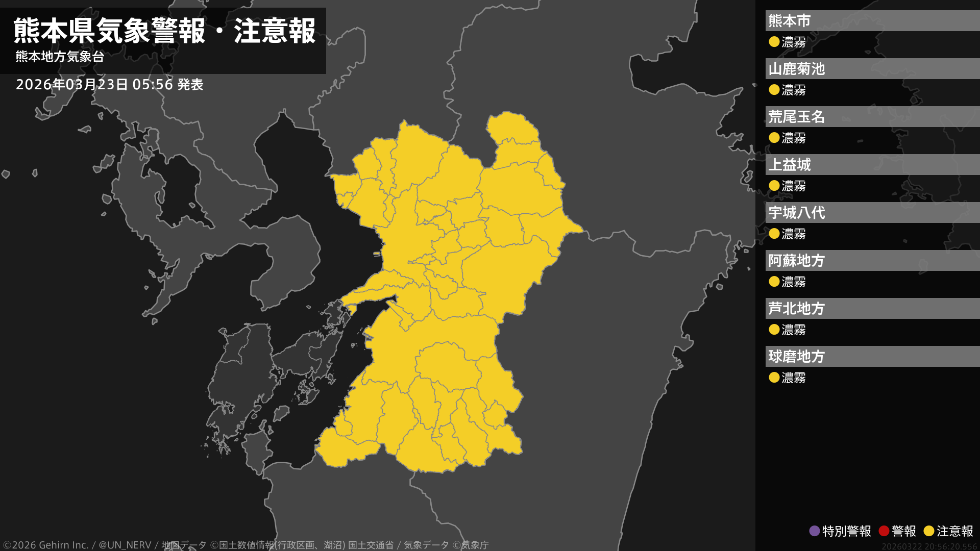 【熊本県 気象警報・注意報 2026年03月23日 05:56】熊本県では、23日昼前まで濃霧による視程障害に注意してください。#気象警報注意報 #熊本県