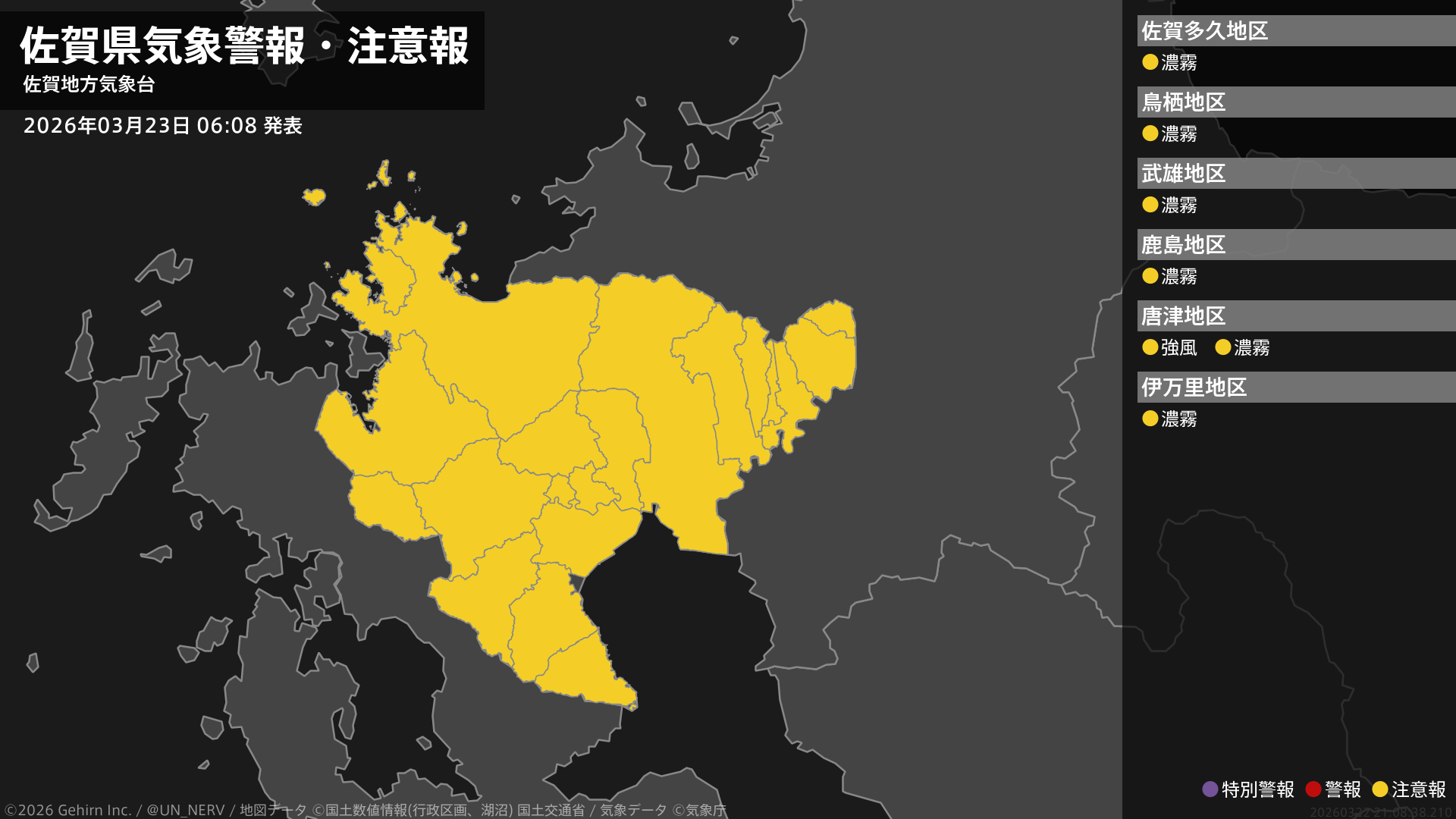 【佐賀県 気象警報・注意報 2026年03月23日 06:08】北部では、23日昼過ぎから強風に注意してください。佐賀県では、23日昼前まで濃霧による視程障害に注意してください。#気象警報注意報 #佐賀県