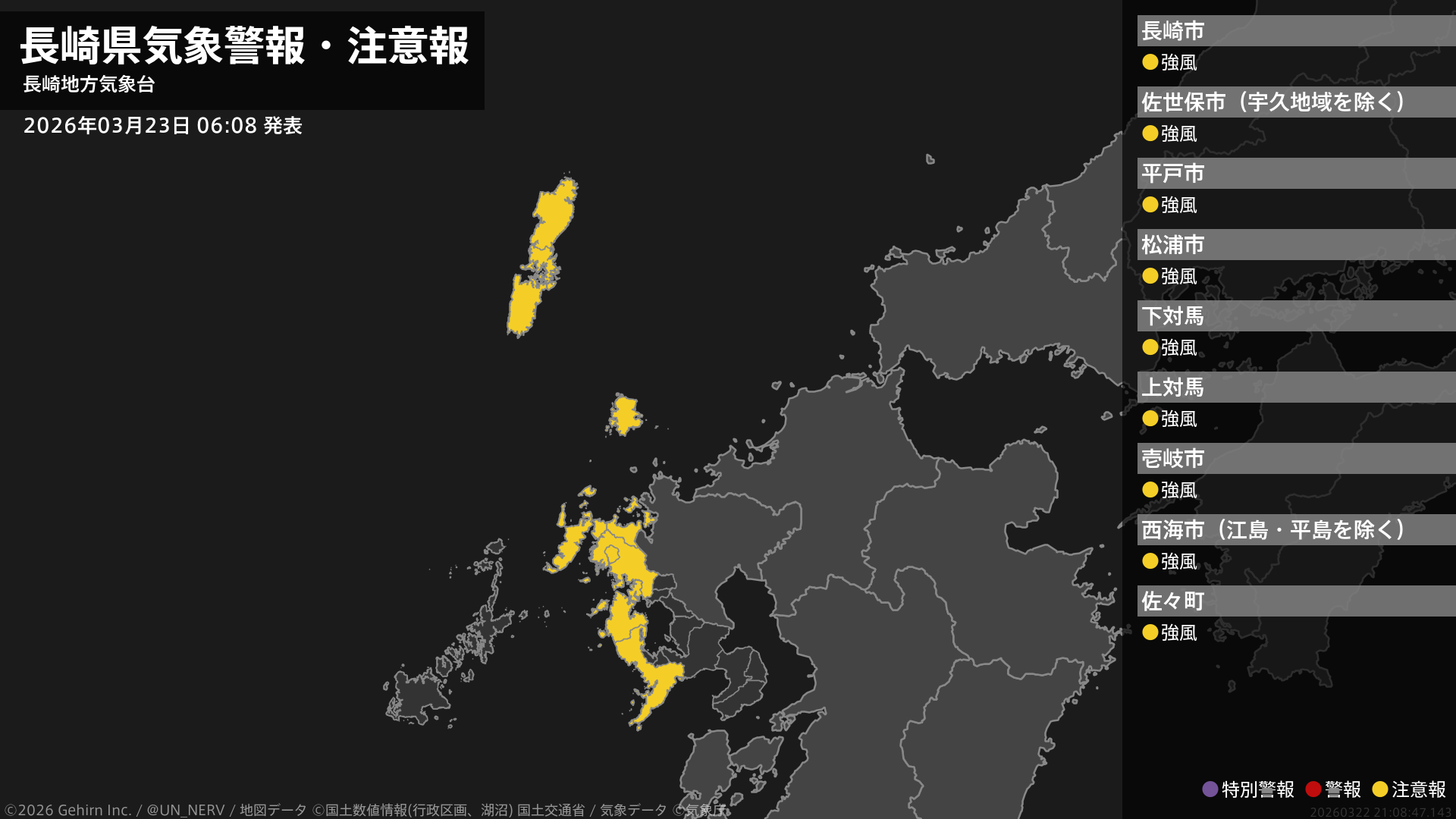 【長崎県 気象警報・注意報 2026年03月23日 06:08】南部では23日昼過ぎから23日夜遅くまで、壱岐・対馬では23日昼過ぎから24日明け方まで、北部では23日昼過ぎから、強風に注意してください。#気象警報注意報 #長崎県