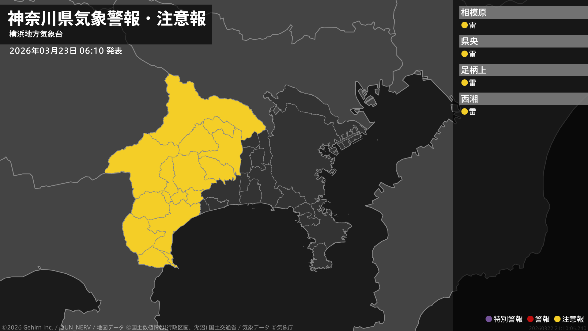 【神奈川県 気象警報・注意報 2026年03月23日 06:10】西部では、23日昼過ぎから23日夕方まで急な強い雨や落雷に注意してください。#気象警報注意報 #神奈川県