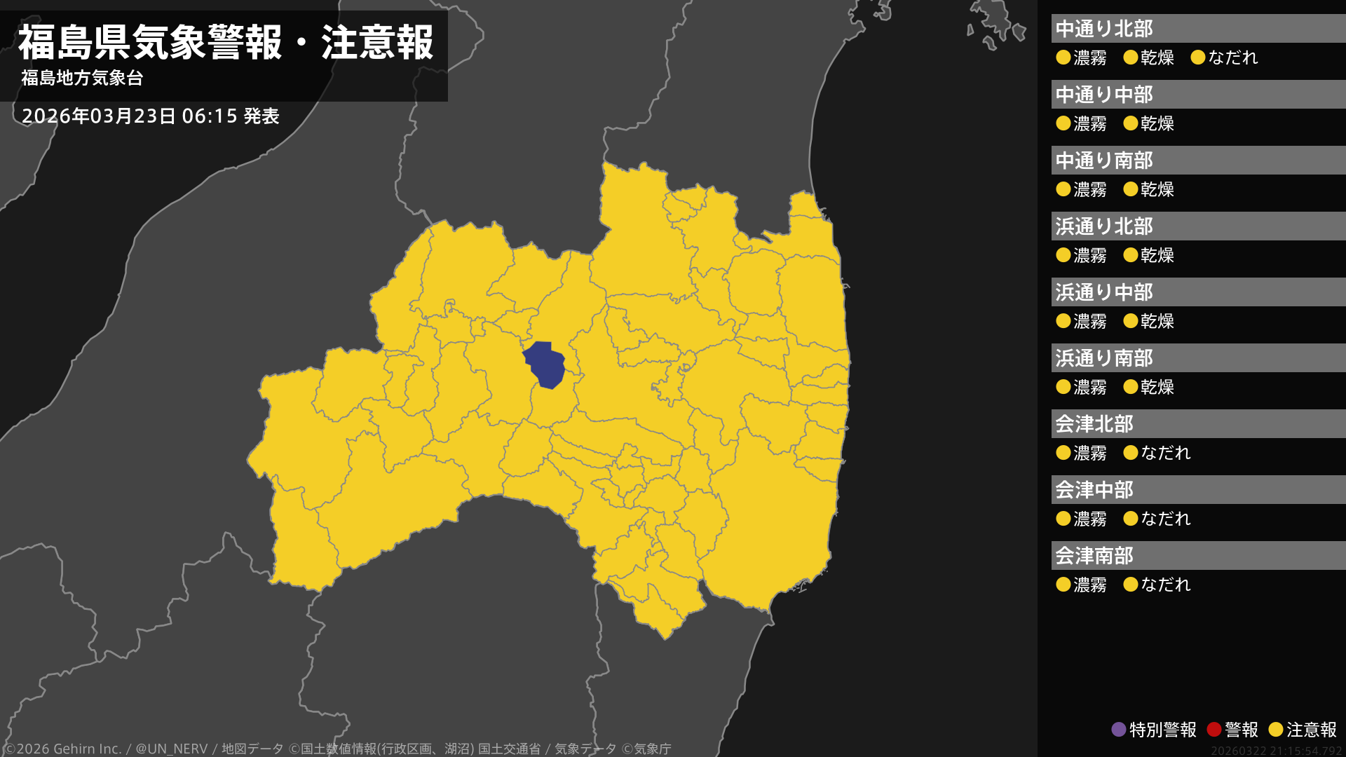 【福島県 気象警報・注意報 2026年03月23日 06:15】福島県では、濃霧による視程障害に注意してください。中通り、浜通りでは、空気の乾燥した状態が続くため、火の取り扱いに注意してください。中通り、会津では、なだれに注意してください。#気象警報注意報 #福島県